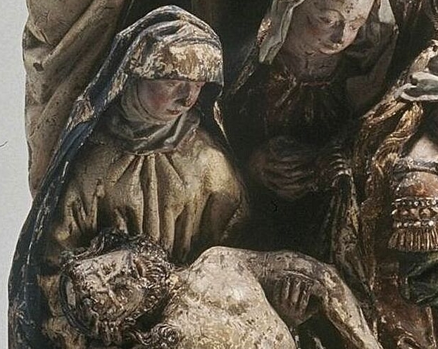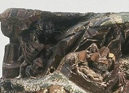 Kijk nu eens naar de bergen op de achtergrond. Bij de sculptuur van het Rijksmuseum is alles globaler, we zien keien, een doodshoofd, botten. Bij Boijmans (hier links) zien we in het berglandschap als je goed kijkt nog nuances, linksboven zie je nog enkele mensen, een lopende persoon met een staf of iets dergelijks in zijn hand, een (geknield?) iemand op de grond met een hoed op zijn hoofd. Nog opmerkelijker, wat meer naar het midden: een “bewening” in het klein: vijf figuren buigen zich over een lichaam. Van drie is het hoofd beschadigd. Je moet goed kijken om deze “mini-bewening” te zien en als zodanig te identificeren, maar toen het ooit geverfd was was het waarschijnlijk allemaal veel duidelijker.