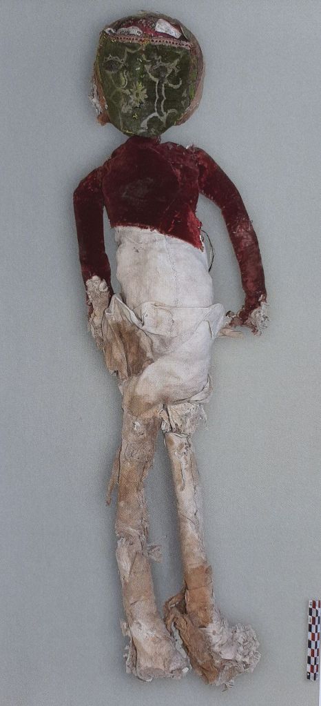 Nog meer bijzonder was de vondst van drie poppen in de vorm van kinderen. Na onderzoek is gebleken dat de poppen zijn gevuld met allerlei menselijke botten en fijne stoffen. Die werden dan omwikkeld met linnen stoffen zodat er een menselijke figuur ontstond. Hoewel de kleding sterk verteerd is en deels ontbreekt, is het duidelijk dat het ging om een groep van drie meisjes, die ook alle drie van een andere leeftijd waren. Deze poppen stammen oorspronkelijk uit de tweede helft van de vijftiende eeuw. Van de buitenste laag stoffen is veel verdwenen. De ogen werden waarschijnlijk weergegeven door glazen kralen en ook neus, wenkbrauwen en mond moeten zichtbaar geweest zijn. De kostbare damast en andere stof is jammer genoeg bijna helemaal weggesneden. In de zeventiende eeuw zijn ze opnieuw aangekleed, ook die kleding is grotendeels verdwenen. Maar er is voldoende van de oorspronkelijke oudste stof over om tot de vroegere datering te kunnen komen. Ook de 45 schedels stammen trouwens uit de tweede helft van de vijftiende eeuw, maar toen waren ze waarschijnlijk niet voor het publiek zichtbaar. Toen men rond 1600 besloot om ze anders en meer in het openbaar te exposeren werden ze versierd met stoffen in uitsluitend de kleuren rood, wit en blauw om zo tot een eenheid te komen. De drie meisjes werden vanaf de baroktijd waarschijnlijk bij het hoogaltaar geplaatst. Ook zij waren lid van het gezelschap van Ursula.