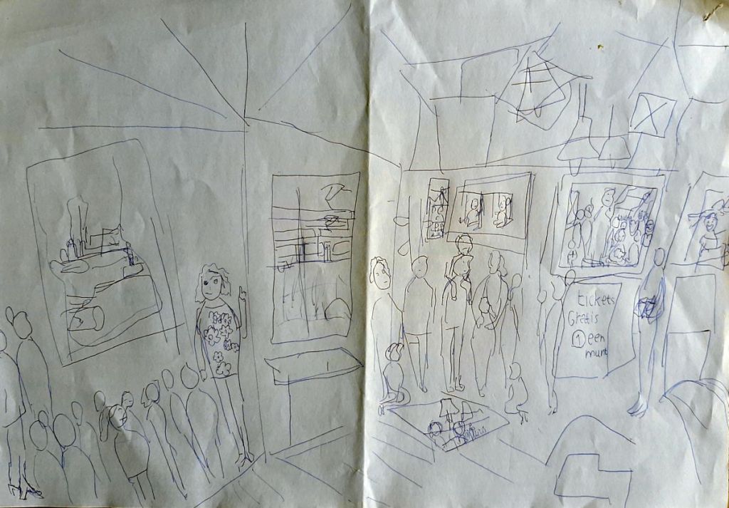 Thuis tekende hij de nieuwe wereld van de mondkapjes. En nog meer dingen. Zoals een “glijbaanrestaurant”. Waar aan de wand schilderijen hangen die hij gemaakt heeft. En er zijn nog veel meer fantastische dingen in dat restaurant te zien. Het restaurant is van de moeder van Laura.