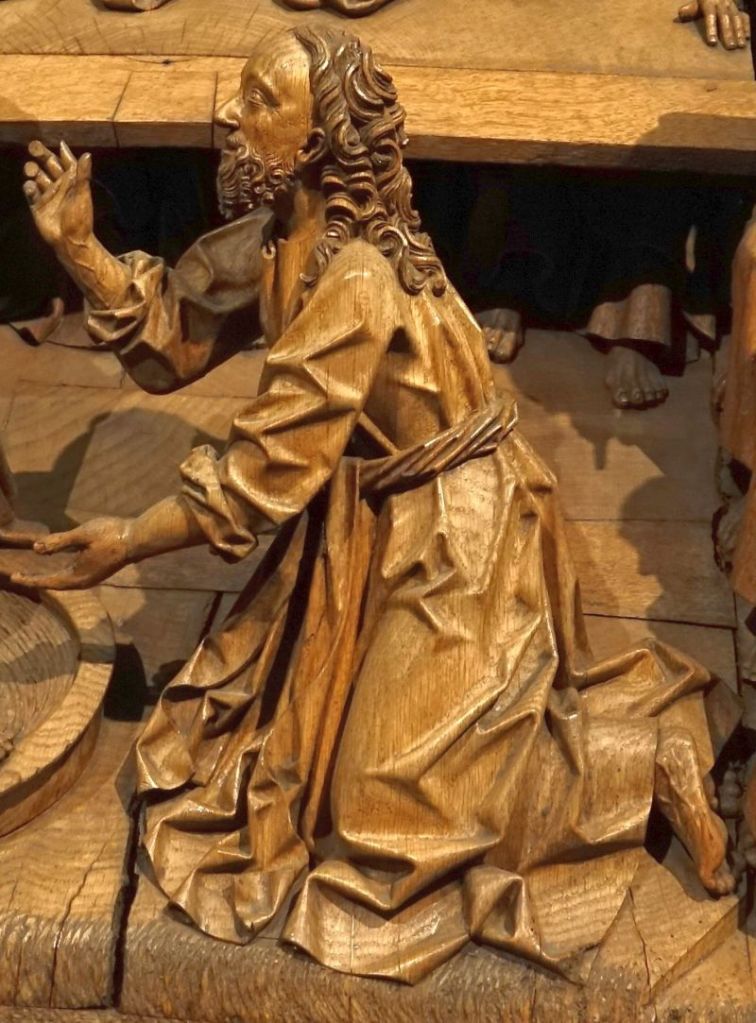 Ik moest bij het kijken en overpeinzen van de rechter scene, waarover zo meer, denken aan twee componisten en aan een schilder. De eerste componist aan wie ik dacht is Mozart. Mozart maakte zijn requiem niet af, want hij kwam te overlijden. Een complete schets van het hele stuk was er wel al en een leerling van Mozart maakte de grote compositie op basis van de schets af. Alleen het inleidende eerste deel, het “Requiem Aeternam”, en het “Kyrie” zijn feitelijk door Mozart geschreven. En dat kun je horen. De rest van de uitwerking is dus gemaakt door zijn leerling Süsmayer, en het is duidelijk van mindere kwaliteit. De tweede componist aan wie ik moest denken is Bach. Bach schreef “Die Kunst der Fuge.” Het stuk was bijna af, toen kwam hij te overlijden. Nog steeds proberen sommige mensen het stuk af te maken. Elke poging leidt tot iets dat soms aardig is, maar nooit in de buurt van de kwaliteit van Bach komt. Zowel het requiem van Mozart als “die Kunst der Fuge” van Bach zijn desondanks uitzonderlijke meesterwerken. En dat brengt me op meester Arnt. Meester Arnt had op zijn oude dag de opdracht aangenomen om vanuit Zwolle te werken aan het hoogaltaar van de Nicolaikerk van Kalkar, een enorme opdracht die hem heel erg lang nog interessant werk zou geven. Het geheel maakte hij af in schetsen. Sommige delen maakte hij zelfstandig zelf helemaal af. De rest: je raadt het al. De eerste die een poging waagde om het na zijn dood af te maken was Jan van Halderen, een leerling van meester Arnt. De twee linker scenes van de predella zijn door hem uitgewerkt, terwijl rechts, de voetwassing van Christus, door Arnt nog is gedaan. Jan van Halderen deed het niet slecht maar de opdrachtgevers wilden toch met iemand anders verder. Zo is het complete beeldhouwwerk uiteindelijk door drie verschillende kunstenaars uitgewerkt, de derde die aan de slag mocht was Meister Loedewich, hij werkte uiteindelijk het leeuwendeel uit. Alle kunstkenners van nu geven de voorkeur aan het deel dat de oude Arnt uitwerkte. Dat zijn delen van de kruisigingscene, maar ook het meest rechtse deel van de predella, de scene met de voetwassing. Deze was ook op de tentoonstelling te zien.