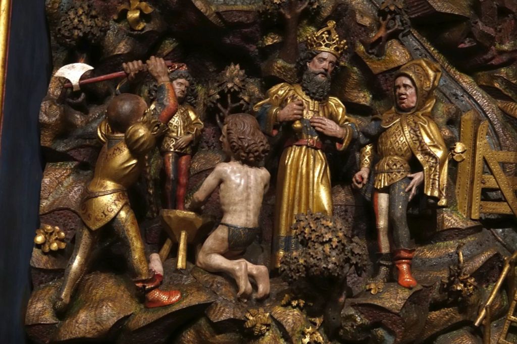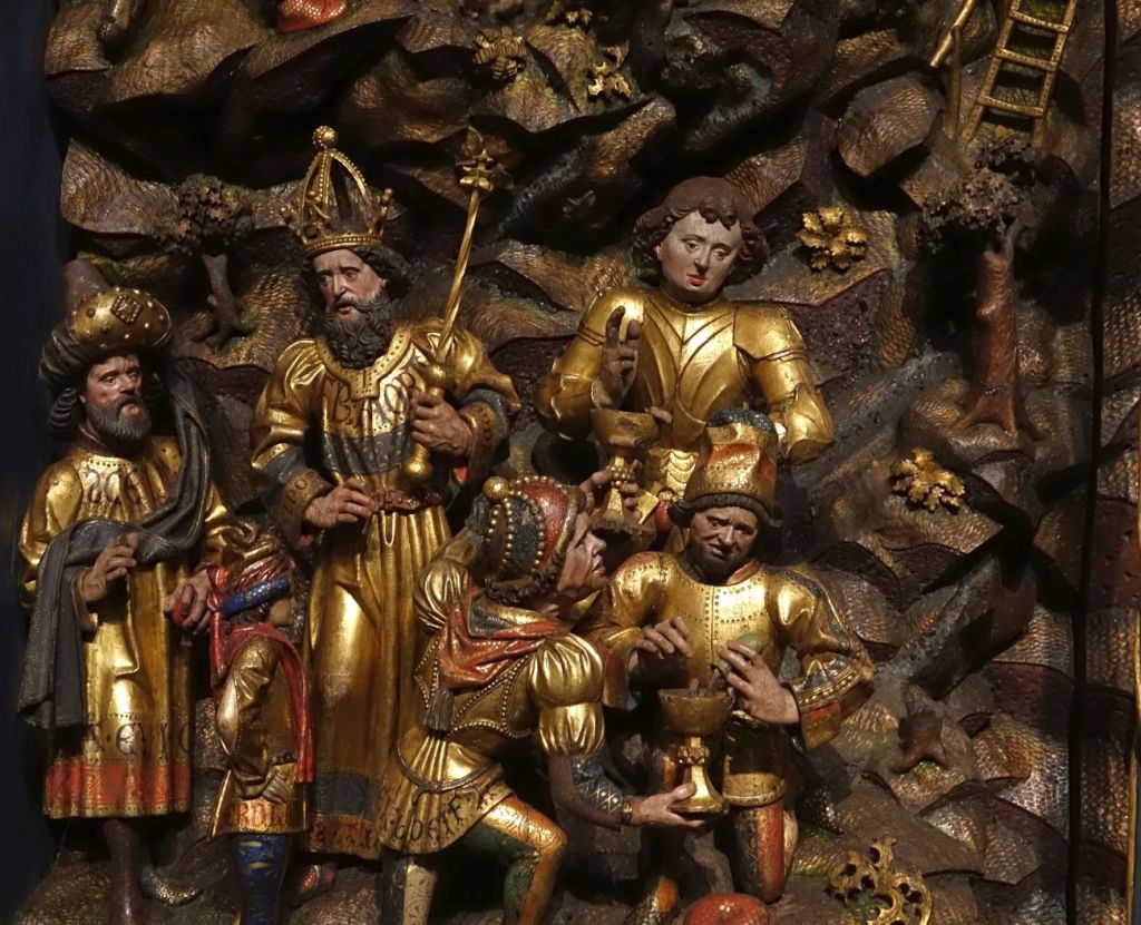 Nu beschrijf ik kort nog een voorbeeld, ook te zien op de tentoonstelling. Het gaat om een scene uit de predella van het hoofdaltaar van alweer de Nicolaikirche. (Hierboven deze predella.)
