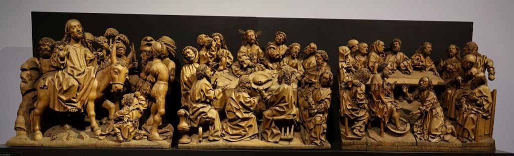 Als je nog nooit iets gezien hebt van deze kunstenaar dan moet je nu snel naar Keulen gaan en je daar laten overtuigen van zijn vakmanschap en diepgang. Nog ruim een week is er de tentoonstelling “Arnt der Bilderschneider” te zien. Niet alles wat hij in zijn leven gemaakt heeft is daar opgesteld maar er staat wel erg veel. Hij heeft voornamelijk voor opdrachtgevers gewerkt aan geestelijke beeldhouwwerken. Die staan normaal in kerken of kloosters en ze zijn soms ook nog eens erg groot, zoals het hoogaltaar van de Nicolaikirche in Kalkar. Het retabel is helemaal door Meister Arnt ontworpen maar helaas slechts gedeeltelijk ook door hem uitgewerkt door zijn vroegtijdige overlijden. Alleen de predella, het onderstuk, is naar museum Schnütgen gehaald.