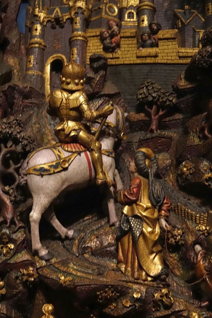 Ik maak een keuze en beperk me tot twee stukken. Om te beginnen het middendeel van het retabel van het Sint Joris-altaar uit de Nicolaikirche dat je hier boven ziet. Deze kerk had tot en met de Franse tijd maar liefst 15 altaarretabels. Na de Franse tijd was het nodig dat ze allemaal gerestaureerd zouden worden, maar daarvoor ontbrak het geld. Men besloot om er slechts zes te behouden en de rest te verkopen. De zes die overbleven zijn inderdaad gerestaureerd en ze zijn er nog steeds te zien. Het zijn altaarstukken die een tijdsperiode van ongeveer 200 jaar omspannen, van pakweg de tweede helft van de vijftiende tot en met de eerste helft van de zeventiende eeuw. Allemaal zijn ze van grote kwaliteit. In Kalkar kun je zo een les kunstgeschiedenis krijgen, van renaissance tot en met barok, aan de hand van deze retabels. En een van die retabels is bovenstaand Gregorius (Joris) retabel. Het is een drieluik waarbij je in gesloten toestand aan de twee geschilderde zijpanelen aan de ene kant het gevecht van Joris met de draak kunt zien, aan de andere kant kun je zien hoe de stichter met zijn familie toekijkt. Maar in geopende toestand komt niet alleen het imposante beeldhouwwerk tevoorschijn, maar zie je ook op de zijpanelen vreemd genoeg iets dat er eigenlijk niets mee te maken heeft: je ziet dan twee scenes uit het leven van de heilige Ursula, geschilderd door een andere kunstenaar. Ik beperk me nu tot alleen het imposante middendeel, het beeldhouwwerk van meester Arnt, over het leven van Sint Joris.