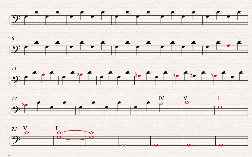 Het eerste wat hij mocht doen was een ostinaat spelen met de noten G-D, terwijl Boudewijn daarboven een beetje improviseerde. Die ostinaat deed mijn kleinzoon uitstekend, maar hij kon het niet nalaten na elf maten om er toch ook zelf wat aan toe te voegen. Heel bewust begon hij met het regelmatig vervangen van de lage G door een andere toon. Eerst verving hij deze met een A, dan met een B, daarna met een Bes, drie keer met een As, dan weer met een Bes. En hij luisterde heel goed hoe muziekstukje afgerond zou kunnen worden. Eerst speelde hij C-D, voor de muziekkenners: een afsluiting met subdominant en dominant (IV-V), die bleef aangehouden, dan de oplossing G (I), nogmaals de dominant D (V), en de tonica met twee tonen G en D tegelijk, dit alles precies op tijd. Als toetje speelde hij nog een heel lage G met het pedaal er achter aan natuurlijk. Hé, dat klinkt mooi! Nog een paar keer. Intussen luisterde hij vol aandacht naar het mooie bel-geluid van de lage bas-g. Het leek wel een kerkklok die de uren aangaf! Ik vond het allemaal erg muzikaal, vooral ook door zijn timing, luister maar, en let dan dus op het lagere register. Ik heb in noten genoteerd wat hij in de bas speelde. De noten in rood zijn de eigen nieuwe noten, die hij heel bewust uitprobeerde: