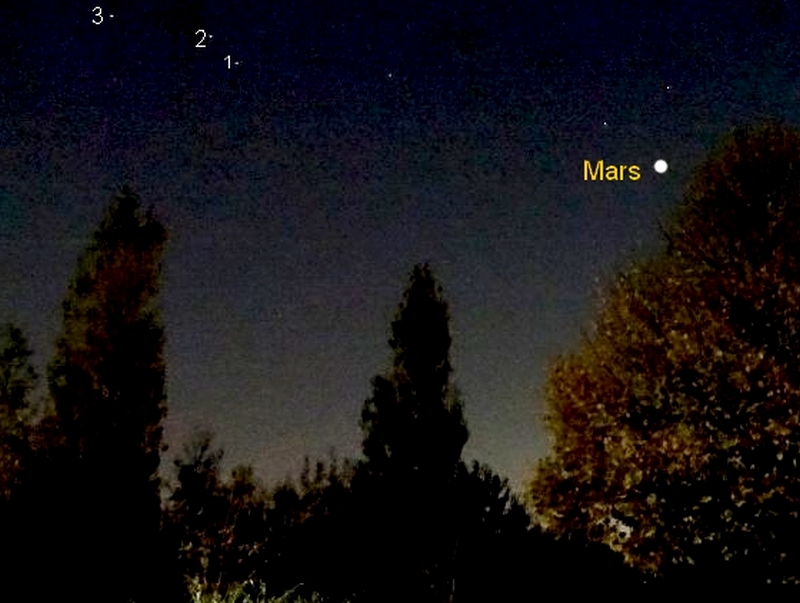 Deze foto is eergisteravond om kwart voor zeven ’s avonds gemaakt. De camera was gericht naar het zuid-oosten. Het meest heldere object is Mars, maar je ziet ook al veel van zijn buren. Het zijn geen spectaculair heldere sterren, die komen pas enkele uren later op. Of je moet naar het noordoosten kijken (Capella), het Noordwesten (Arcturus) of recht omhoog (Vega en Deneb). Om Mars heen zie je vooral veel sterren van het sterrenbeeld vissen. De magnitude (helderheid) van al deze sterren ligt tussen 2 en 5. Waarbij 2 aangeeft dat een dergelijke ster nog behoorlijk goed te zien is. Magnitude 5 is al veel minder goed zichtbaar. Maar desondanks pikte mijn camera ze redelijk goed op. Ik vertel iets over drie van deze sterren, op onderstaand kaartje de sterren met de nummers 1. 2 en 3. Deze zijn erg goed te zien, ze zijn van het sterrenbeeld Aries (ram).