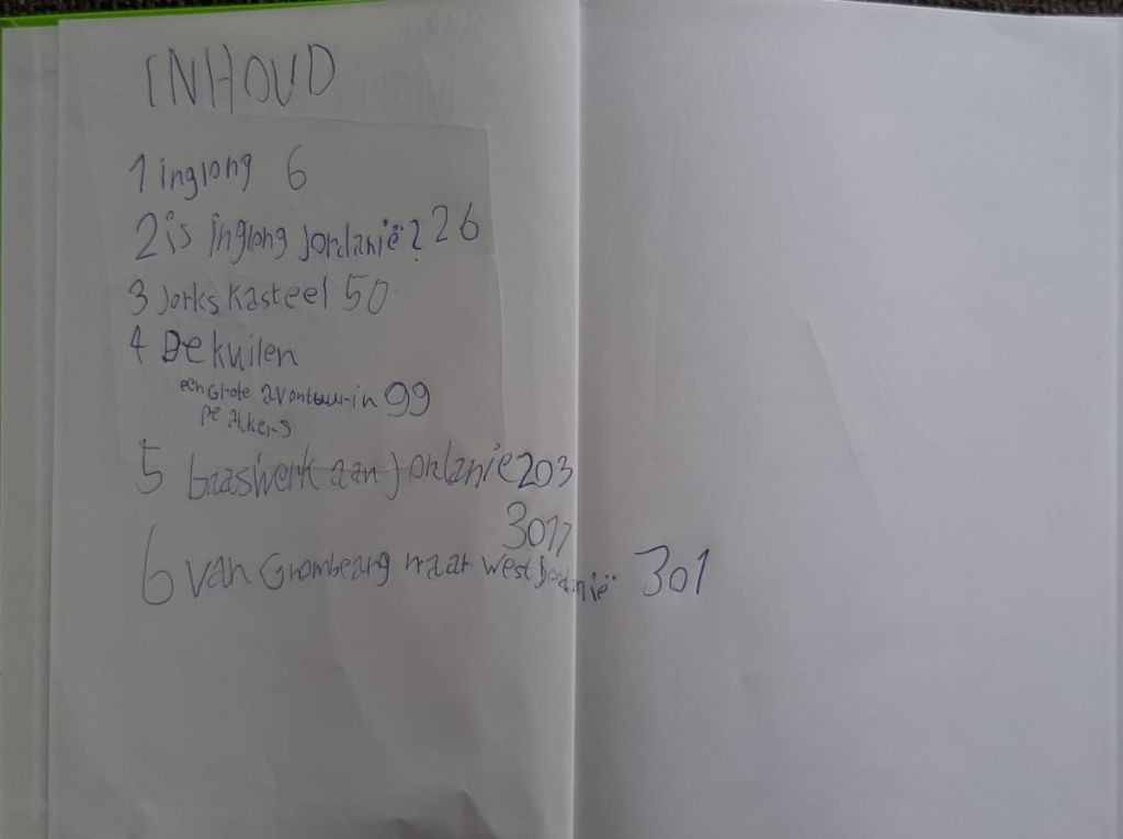 De hele kamer ligt bezaaid met tekeningen. Ook liggen er allerlei A-4tjes met uitvoerige teksten. Ter gelegenheid van de kinderboekenweek kregen de kinderen van groep vier de opdracht om een verhaal te schrijven. Het mooiste verhaal zou de gouden griffel krijgen. Wie was de winnaar? Niemand minder dan mijn oudste kleinzoon! Ik heb het verhaal niet gelezen maar het verwondert me niet.