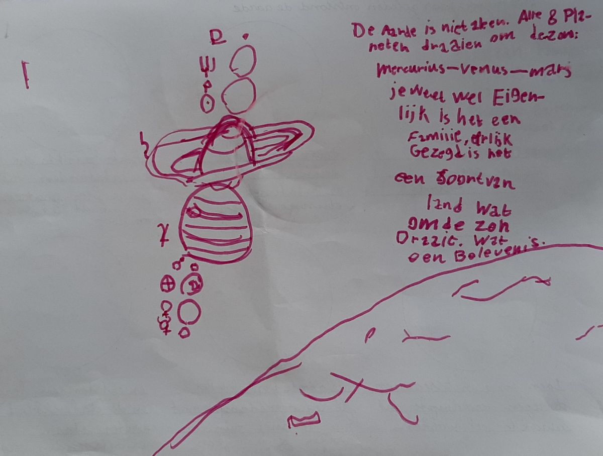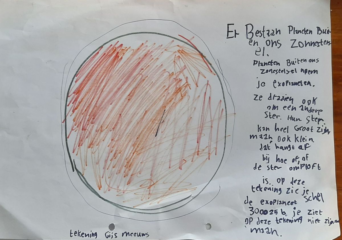 Dat zijn enkele van de vragen die mijn oudste kleinzoon mij de laatste weken herhaaldelijk stelt. Ik antwoord dat ik dat allemaal niet wil en zeker ook niet durf. ‘Nee’, zegt hij dan. ‘De aarde is toch wel de fijnste planeet’. Maar desondanks is hij toch veel met onaardse dingen bezig. En dan voelt hij zich een echte wetenschapper. Maandag mocht hij op school aan zijn medeleerlingen voor het digibord van alles vertellen over Saturnus. Dat de ringen zijn ontdekt door Christiaen Huijgens en dat de grootste maan Titan heet bijvoorbeeld. Zijn juffrouw stuurde twee leuke foto’s waarop hij een en ander staat aan te wijzen voor een geïnteresseerd publiek. Over exoplaneten schrijft hij wetenschappelijke publicaties met bijbehorende afbeelding, zoals deze over de exoplaneet Schel 300025b. (Galileo Galilei tekende ook altijd van alles bij zijn wetenschappelijk werk).