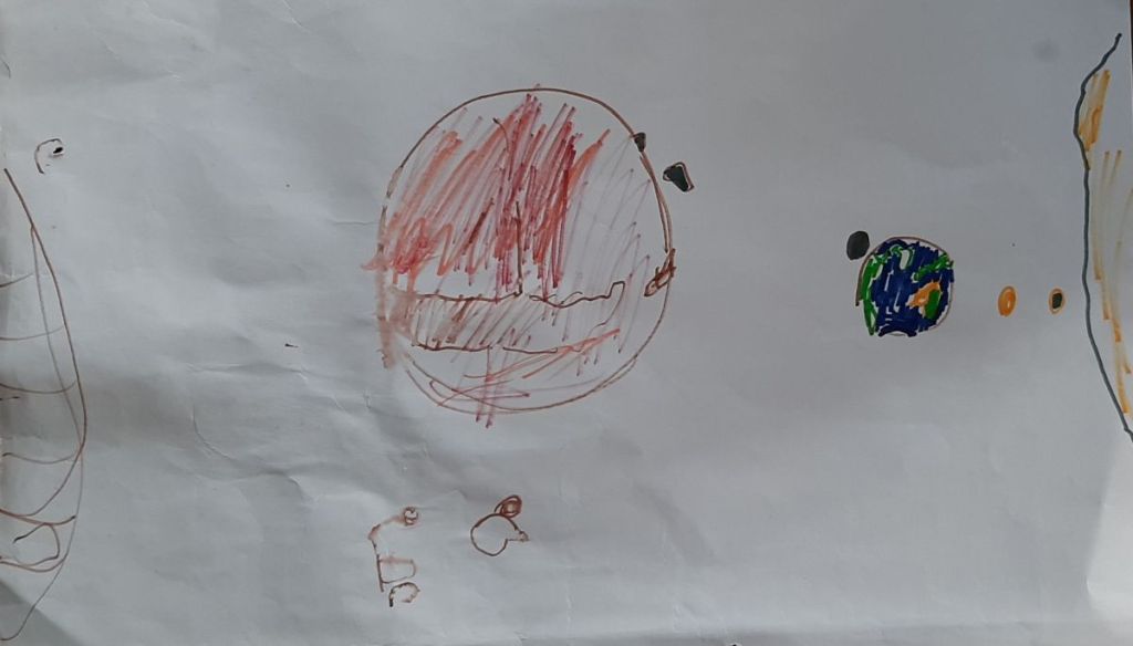 De volgende tekening is gemaakt van vlakbij Mars. Mars zie je erg groot, met een van zijn bizarre maantjes Deimos. Ook de aarde met de maan kun je daar goed zien en nog verder Venus, Mercurius en de Zon. Links nog een stukje van Jupiter. Hij vroeg mij of je vanaf Mars de aarde kunt zien.