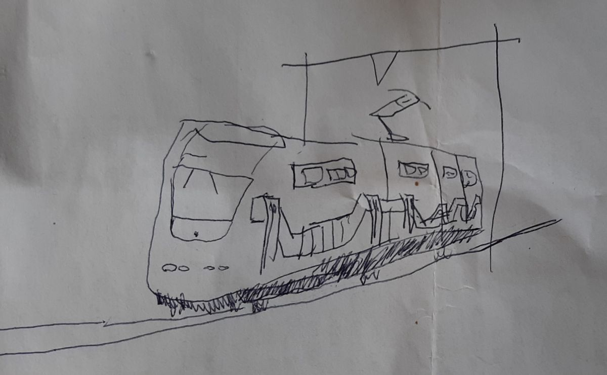 Heel aards: af en toe tekent hij ook weer een trein. De aanleiding was Finland. Bij zijn ouders heeft hij een hele serie gemaakt over Finland. Hij heeft ook de reis er naar toe getekend, dat was met een trein. Deze trein hieronder gaat nergens naar toe maar is gewoon een trein.