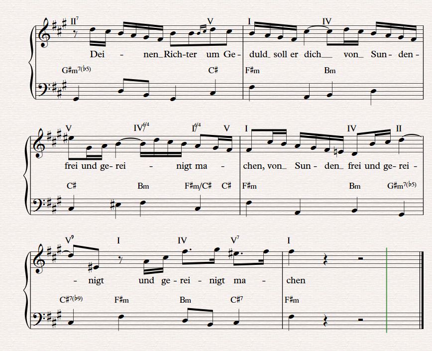 Het slot van deze passage licht ik er nog even uit. Hoe laat Bach ons horen dat je ziel gereinigd kan worden? Bijvoorbeeld door de keuze en plaats van de akkoorden. Je kunt het proces volgen in onderstaand fragmentje van de partituur. Harmonisch zien we een voortdurende herhaling van afsluitende cadensen (II-V-I, IV-V-IV64-I64-V-I, IV-II-V9-I, IV-V7-I). Maar bij slechts twee van deze cadensen gaat zowel de muziek naar een zwaar moment als wordt ook de tekst daar afgesloten: dat is na “gereinigt machen”. Als je bent gereinigd dan is er iets afgesloten, dan is het klaar. Het woord “gereinigt” springt er alle drie de keren zo wie zo uit. De eerste keer ritmisch: reinigen is een proces, je hoort hoe het woord verlengd wordt. De tweede keer begint “reinigt” op de verminderde kwint van het verminderde G#-akkoord, maar die lange toon, een D, wordt pas echt dissonant als hij overgaat in de dissonante kleine noon van het dominant none-akkoord. Deze toon maakt dan ook nog eens een enorme sprong van een verminderde septiem naar beneden: nu wordt de zondaar pas echt aangepakt om schoon gemaakt te worden! De derde keer, vlak voor het slot, is er nog een zekere ritmische benadrukking van het “gereinigt machen” door de twee gepuncteerde figuurtjes.
