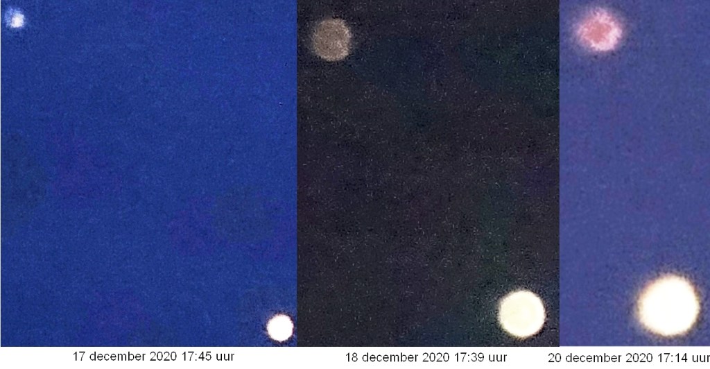 Jupiter en Saturnus kruipen naar elkaar. Van 17 tot 20 december (19 december ontbreekt) heb ik het proces proberen vast te leggen. Hoe kun je dat zichtbaar maken? Ik heb drie foto’s naast elkaar geplakt, telkens zodanig dat de beide planeten er net linksboven en rechtsonder opstaan. Je ziet dan dat het steeds meer een close-up moet worden waardoor ze steeds groter lijken te zijn. Ook zie je dat de hoek waarmee ze boven elkaar staan verandert. De eerste dag is het nog zo’n 40 graden, de laatste dag staan ze al bijna recht boven elkaar. Vanavond, het moment van de echte conjunctie, gaan ze versmelten om 19:26 uur. Dan zijn ze al onder de horizon. De beste waarnemingsmogelijkheden zijn zo tussen 17:15 en 18 uur in het zuid-westen. Mits er geen wolken zijn…