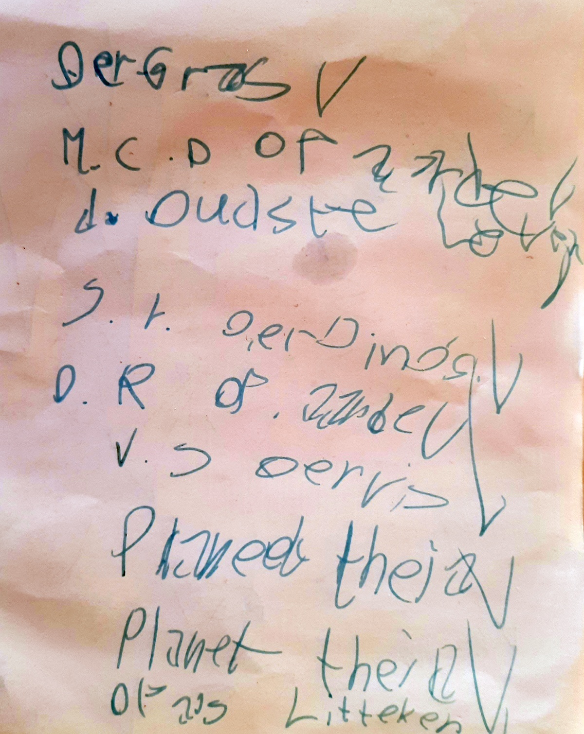 De tweede tocht door het onderzoeksterrein was mijn vrouw er ook bij. Zij leerde mijn kleinzoon op een gegeven moment om niet alles voluit te schrijven, maar om afkortingen te maken. Dan kon hij het thuis nog verder uitwerken.