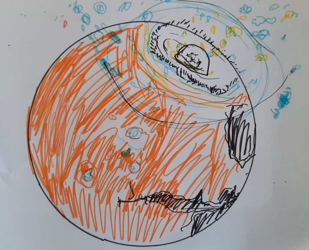 Maar nu vandaag is hij door zijn vader geholpen met zijn huiswerk en had hij net een videogesprek met zijn juf. Zijn moeder had een stukje opgenomen van dat gesprek en stuurde het door. Het ging over de botsing van Theia met de aarde. Hij vond het helemaal niet eng meer. Het was heel erg lang geleden gebeurd. En misschien gebeurt het ooit nog een keer, maar dan zijn er geen mensen meer, de mensen zijn dan al lang uitgestorven. Net als de dinosaurussen.