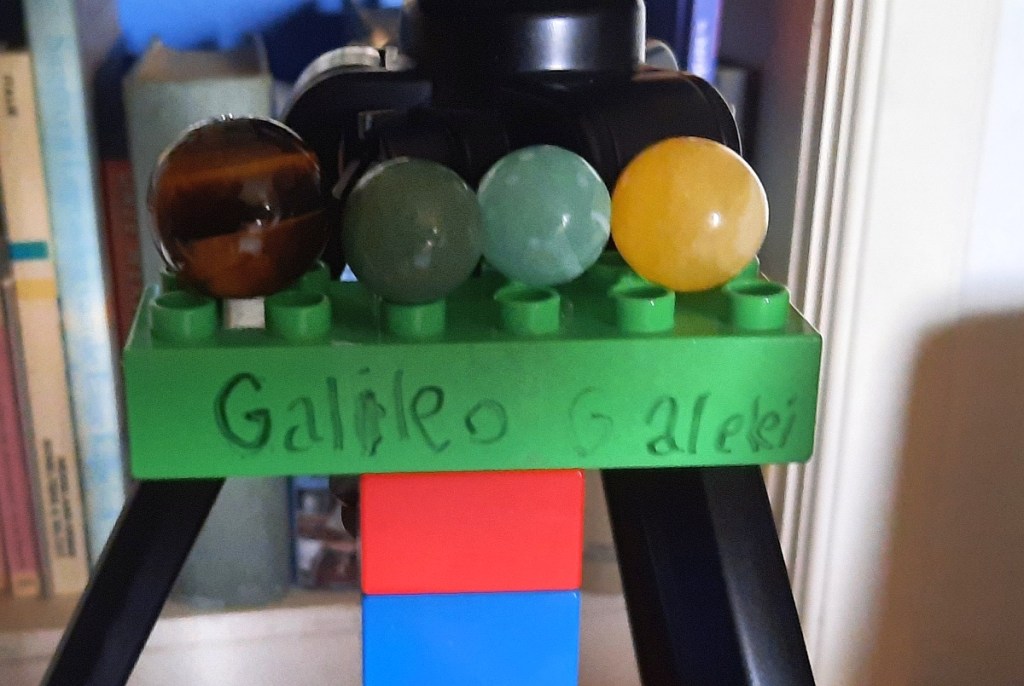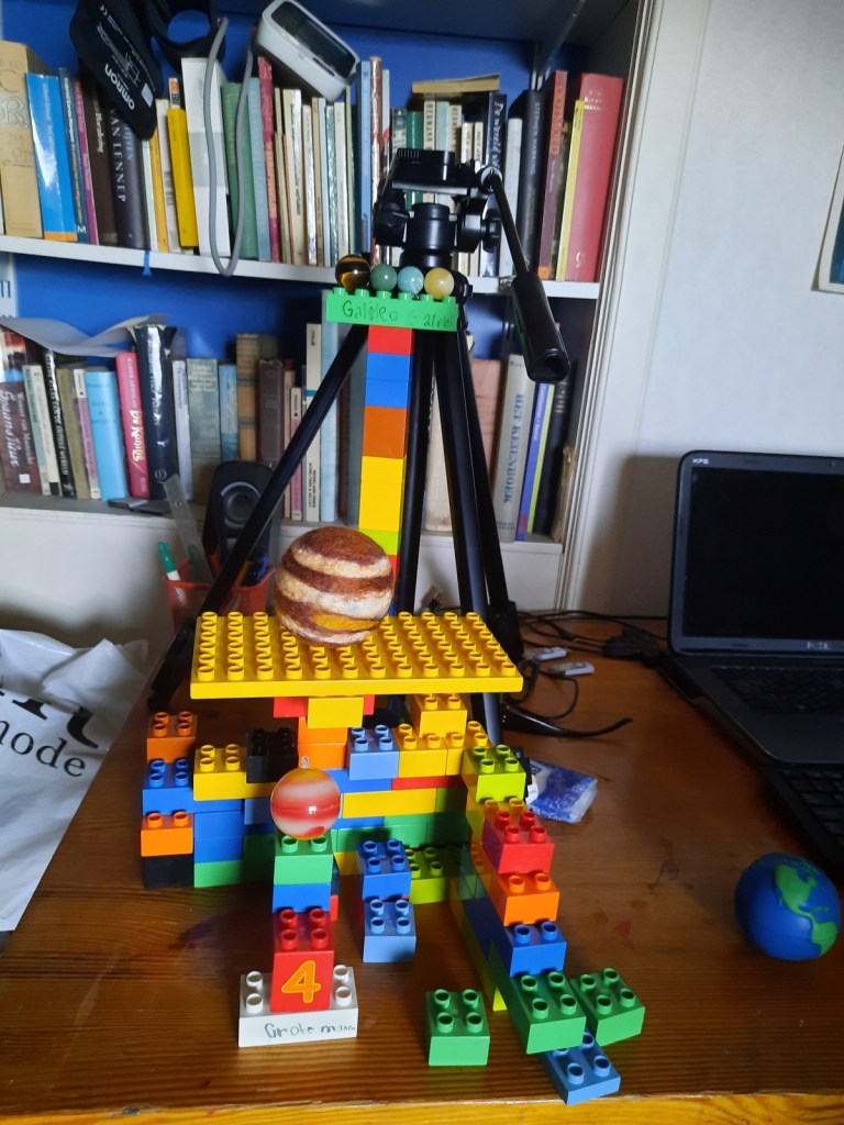 Hij had mijn bureau omgetoverd tot een gebouw in Padua, het universiteitsgebouw waar Galileo Galilei ooit heeft les gegeven en waar je zijn zetel nog kunt bewonderen. In zijn geval stond er ook nog een telescoop achter het gebouw, daarvoor had hij mijn camerastatief gebruikt. Het gebouw zelf was opgetrokken uit duplostenen. In zijn presentatie had Galilei aanschouwelijk gemaakt wat hij ontdekt had: de vier grote manen van Jupiter.