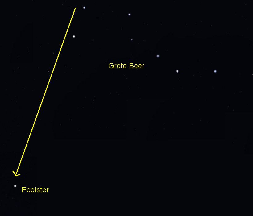 De Grote Beer is een van de meest bekende sterrenbeelden. Zie je de Grote Beer, dan kun je ook makkelijk de poolster vinden. Wat is dat eigenlijk, de poolster? Op wikipedia lezen we: Een poolster is een ster die zich in een van de hemelpolen bevindt. Voor de noordelijke hemelpool is dat de ster met de naam Poolster, Polaris of alpha Ursae Minoris, die dicht bij het verlengde van de aardas aan de noordelijke hemelpool ligt. Gedurende de nacht lijken alle sterren door de rotatie van de aarde in een baan om de pool heen te draaien. De Poolster beweegt vrijwel niet, zodat deze altijd op dezelfde plaats aan de hemel te vinden is. De Poolster was, voor de ingebruikneming van elektronische systemen zoals gps, van groot belang voor de navigatie. De hoogte van de Poolster aan de hemel is vrijwel gelijk aan de breedtegraad waarop de waarnemer zich bevindt; de zegswijze poolshoogte nemen, is hiervan afgeleid.
