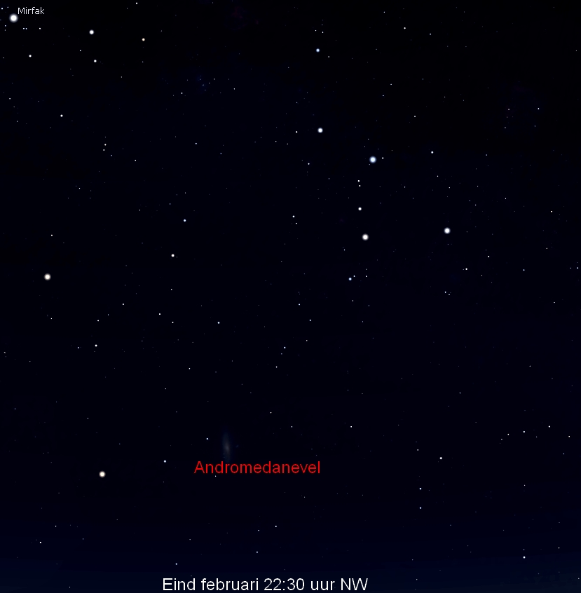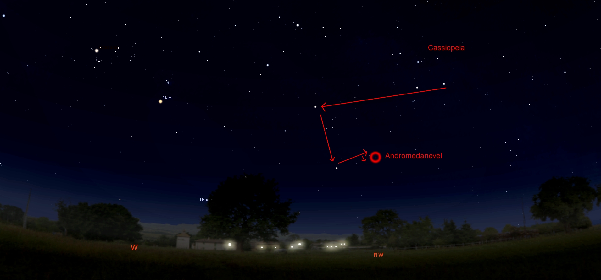 Wat is de beste tijd om een keer te gaan zoeken aan de nachtelijke hemel naar dit melkwegstelsel? Het beste jaargetijde zijn de herfst en de vroege winter. Dan staat het vrij hoog aan de hemel. In de late winter, lente en vroege zomer staat het erg laag en dicht bij de horizon is nooit ideaal. Verder natuurlijk ook liever niet bij maanlicht. Zoals je de poolster kunt vinden vanuit de Grote Beer, zo kun je ook de Andromedanevel vinden vanuit enkele andere sterrenbeelden. Misschien nog het beste kun je beginnen bij het sterrenbeeld Cassiopeia. Dat is circumpolair dus altijd te zien. Herkenbaar als een soort “W”. Maar die W kan wel op zijn kant liggen, hij draait als het ware om de poolster heen. Op bovenstaande foto ligt hij op zijn kant, helemaal rechts. Als je de twee rechtse sterren (als je als het ware een W zou schrijven) met een lijn verbindt kom je, vier keer zover, uit bij een van de heldere sterren van het sterrenbeeld Andromeda. Met een rechthoek maak je weer een denkbeeldige lijn van daaruit naar rechts (in bovenstaand beeld dus naar beneden) en je komt bij een andere heldere ster uit van dit sterrenbeeld. Weer met een rechthoekige lijn terug parallel met de eerste lijn (in bovenstaand beeld naar rechts) zie je al snel twee wat mindere heldere sterren. Een klein beetje rechts van de laatste van die twee sterren (in dit geval dus er onder) staat de Andromedanevel. Zie de twee onderstaande afbeeldingen. Succes!