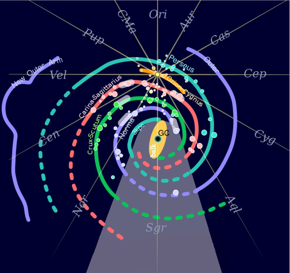 De hemel had nog meer in petto. Toen eenmaal vaststond dat de zon slechts een van de vele sterren was ging men nadenken over de structuur van het heelal. Al in de Griekse mythologie lezen we over “de Melkweg”. Een soort streep aan de hemel die enigszins diffuus is, maar die als je goed kijkt uit talloze sterren bestaat. Feitelijk bleek naderhand dat hetgeen wij “Melkweg” noemen feitelijk de kern is van het galactische stelsel waar onze zon zich in bevindt. Dat stelsel is een spiraalvormig sterrenstelsel, onze zon bevindt zich in een van de kleinere spiralen, zie tekening hier onder. (De ster van waaruit alle strepen getrokken zijn in de “Orion-Cygnus”-arm is onze zon). In het midden bevindt zich een zwart gat. Alle sterren die je afzonderlijk aan de nachtelijke hemel kunt onderscheiden zijn onderdeel van dit galactische stelsel, “onze Melkweg”. We zien trouwens voornamelijk slechts sterren die zich in onze eigen arm bevinden.