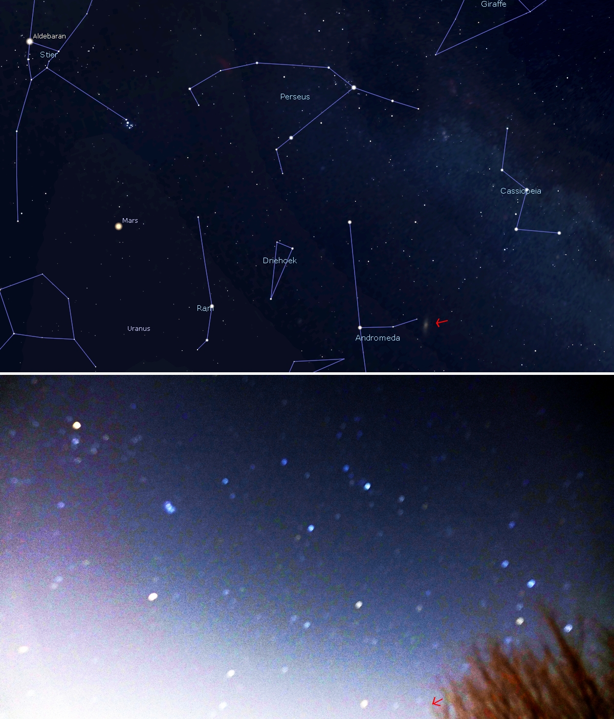 Ik heb zelf de Andromedanevel denk ik voor het eerst bewust gezien zo’n dertig jaar geleden. Als je weet waar je moet zoeken kun je hem makkelijk met een verrekijker en dus ook heel soms met het blote oog vinden. Ik heb hem vijf dagen geleden gefotografeerd. Nou ja. Door vergelijking met een plaatje van de software Stellarium weet ik zeker dat hij het is. Heel, heel erg onbeduidend. Bij het pijltje, Ik beloof dat er een keer een beter plaatje gaat komen.