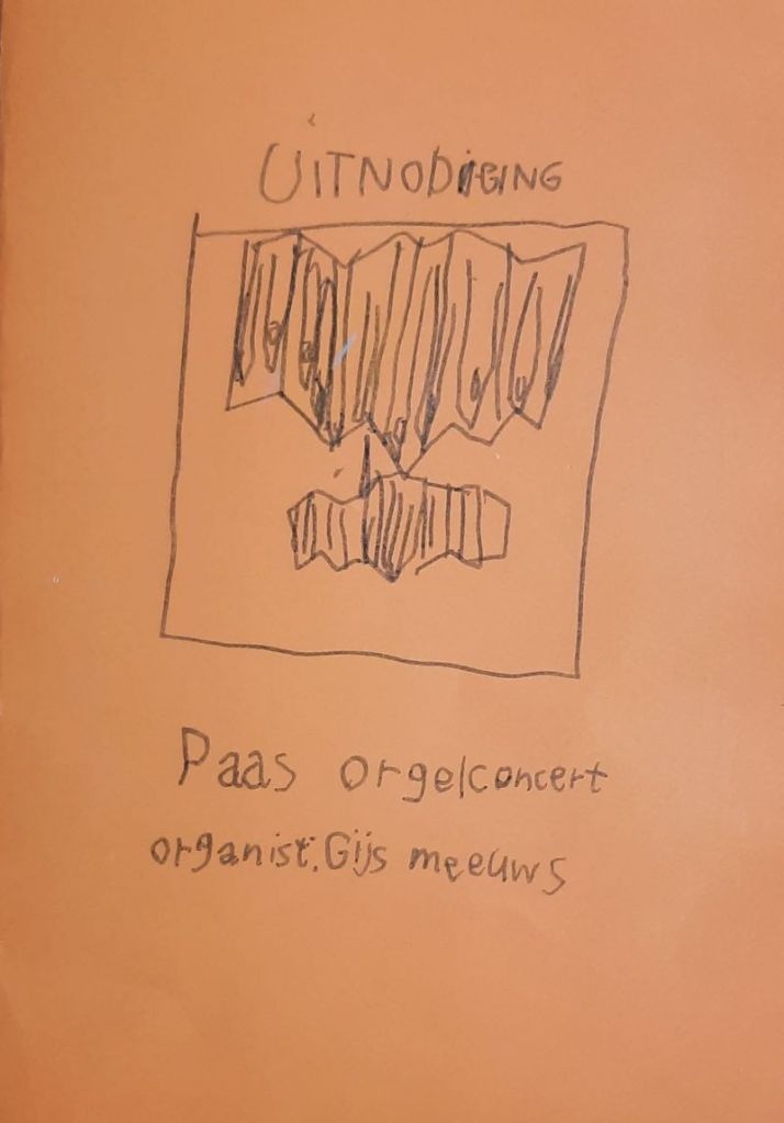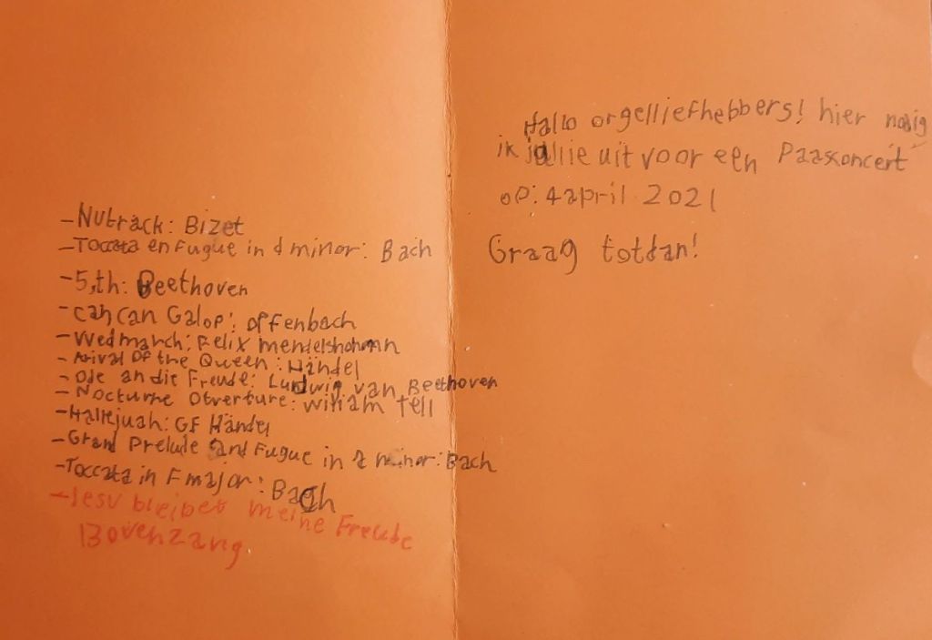 Uiteindelijk wist zijn moeder het een en ander tot drie stukken terug te brengen. Wel echte paasnummers, zoals het Hallelujah van Händel. Maar het moest nog steeds zo echt mogelijk lijken. Zijn moeder zou het concert aankondigen dus kon ze niet tegelijk ook filmen, dat was een heel andere rol. Dat deed ik dus. En dan was er nog de registrant, zijn zusje waar hij dat vaker mee doet. Zo waren de rollen verdeeld. Het orgel stond zoals in een kerk boven en de mensen zaten beneden in de kerk. In de hal beneden werd een rij stoelen voor het publiek geplaatst. Als je omhoog keek zag je wel de orgelpijpen maar niet de organist, alles was zoals het hoort.