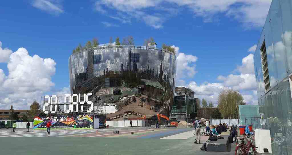 Nog iets eerder waren we in het Museumpark. We wilden nu eindelijk wel eens de “Badkuip” zien, de nieuwste architectonische attractie van Rotterdam. Het gaat om het spiegelende museumdepot van Boijmans van Beuningen dat in het najaar geopend gaat worden. Het enorme gevaarte lijkt helemaal klaar te zijn maar er omheen zijn nog allerlei infrastructurele werkzaamheden bezig. Ook het architectuurmuseum ligt net als Boijmans zelf op de schop. Zo kennen we Rotterdam. Altijd wordt er overal weer gebroken en gebouwd. Jarenlang is het dan een enorme puinhoop. Maar dan is er weer iets klaar, zoals ook de Coolsingel nu eindelijk min of meer “klaar” is. Hij oogt veel rustiger met mooie fietspaden. Er worden prachtige dingen gemaakt in Rotterdam.
