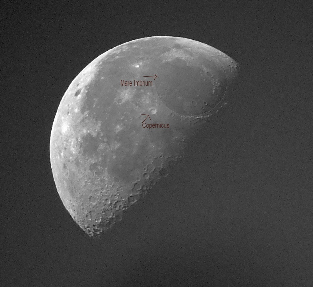 Net ten zuiden van Mare Imbrium zien we een van de meest indrukwekkende kraters van de maan, de krater Copernicus. Ik heb het detail waar hij op de eerste foto staat uitvergroot. Deze krater heeft geen eigen mare opgeleverd, daarvoor ging hij niet diep genoeg, maar er is wel veel materiaal te zien dat in zijn omgeving is uitgestrooid. Veel betere foto’s kun je op internet vinden. Maar je ziet, zelfs overdag kun je als je dat wil en een goede camera of verrekijker hebt ook het een en ander zien.