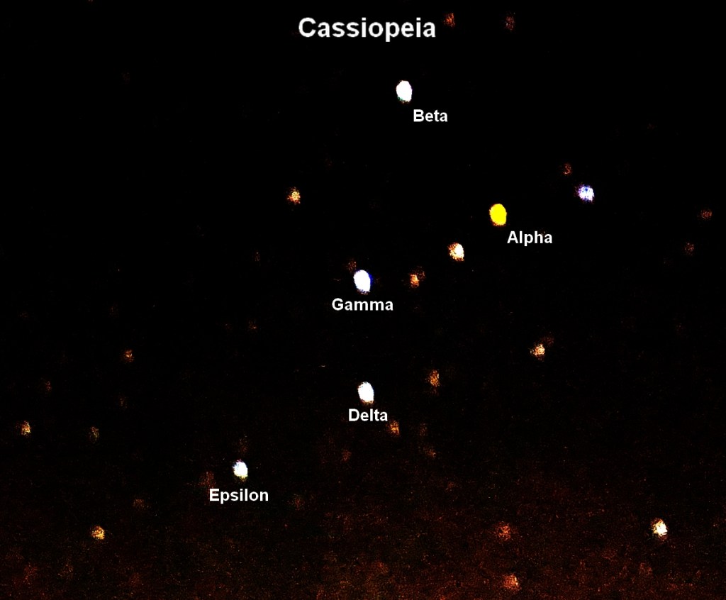 Op de foto die ik gisteren maakte (hier boven) zie je dat alleen de ster Alpha geel is, de rest heeft meer een blauwachtige kleur. Zoals we hierboven bij de beschrijving van de vijf sterren zien is de ster Alpha Cassiopeiae een oranje reus die veel groter is dan al die andere sterren, maar tegelijk ook veel minder heet. Vandaar het verschil in kleur. Waar wij deze vijf sterren als een soort eenheid zien, hebben ze in werkelijkheid niet veel met elkaar te maken. De ster Beta staat op “slechts” 54,7 lichtjaar afstand van onze zon, Delta op 99,4 lichtjaar, Alpha op 228 lichtjaar, Epsilon op 410 lichtjaar en Gamma op maar liefst 550 lichtjaar afstand.