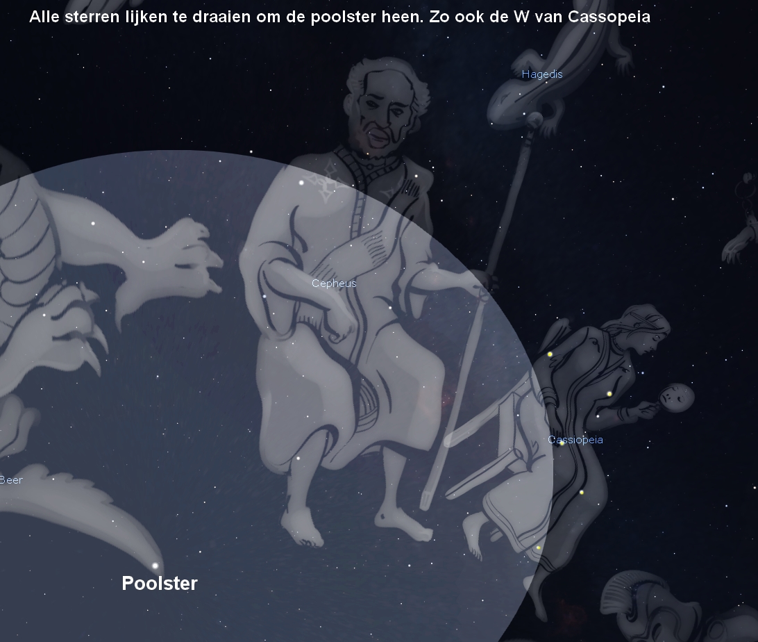 Als je nu in de nacht weer een keer naar Cassiopeia kijkt, denk dan aan deze mooie ijdele koningin die daar staat te zwoegen om de sterrenhemel te laten draaien. Staat de W op zijn kant? Dan moet ze zich goed vasthouden om niet naar beneden te vallen. Als je elke nacht rond middernacht zou kijken dan zie je haar in de herfst heel hoog aan de hemel staan als een W, in de lente heel laag als een M, in de andere jaargetijden zie je haar op zijn kant. En gedurende elke nacht blijft ze ook nog eens tollen… Ach ach, die arme koningin Cassiopeia…