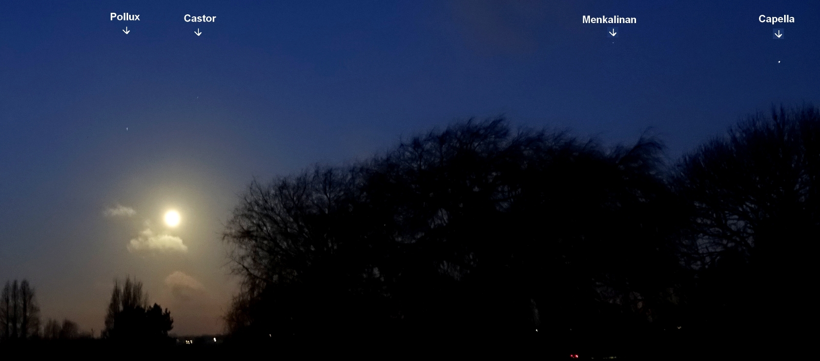 Hieronder staan foto’s van rond half acht vanochtend, de zon moest nog opkomen. In het ZO zag je nog sterren, zoals de superreus Antares. De maan in het NW werd ook nog van sterren voorzien: Pollux, Castor en meer naar het noorden twee sterren van de voerman: Menkalinan en Capella. De laatste foto maakte ik toen de zon net op was om vijf voor negen.