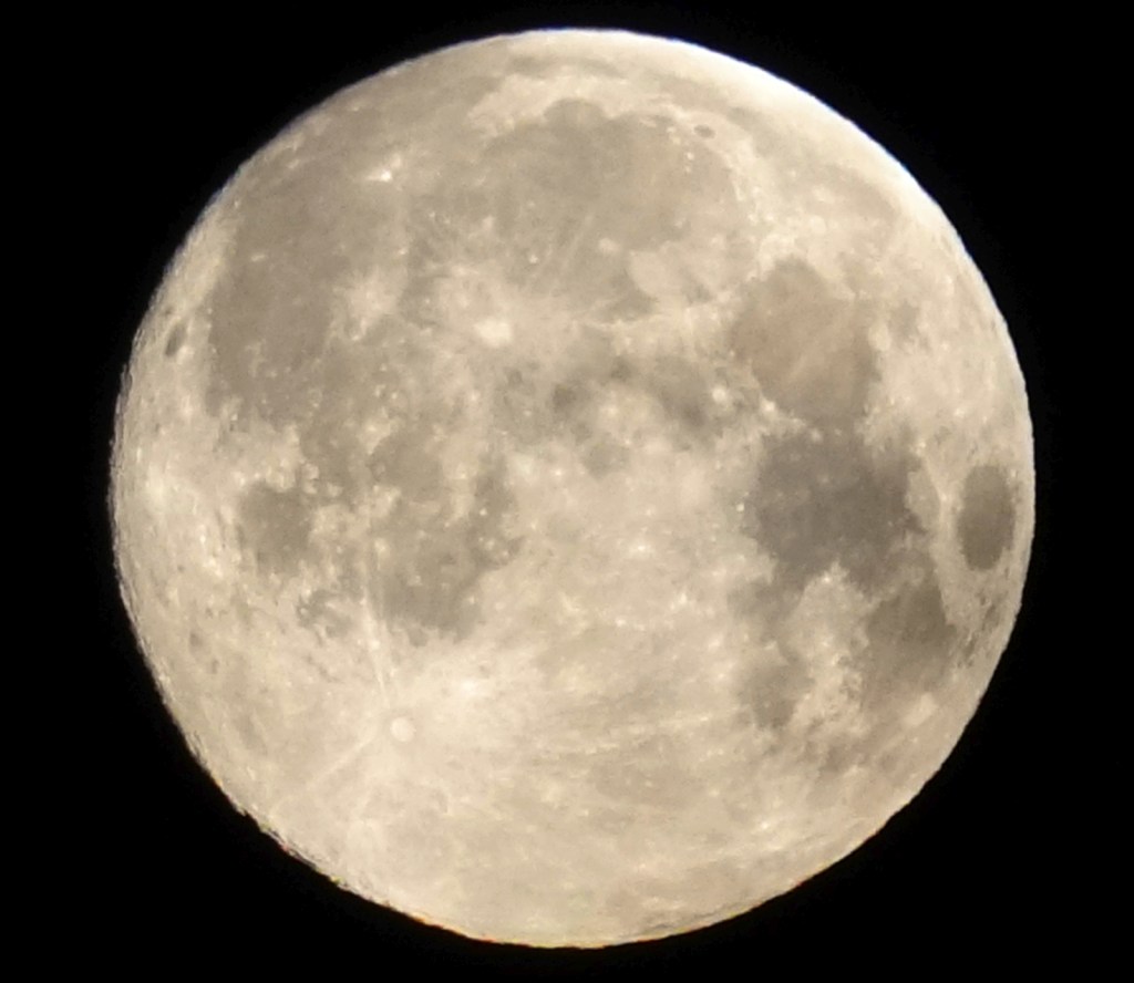 Komende nacht (9 minuten voor 1) is het exact volle maan. Maar een dag ervoor of erna lijkt de maan ook al helemaal vol. Afgelopen nacht was het helder, de maan stond de hele nacht te schitteren en het licht van de sterren werd er danig door getemperd. Nu is het al weer bewolkt aan het worden, en de echte volle maannacht, komende nacht is waarschijnlijk niet zo mooi als die we net gehad hebben. Het is op dit moment ook geen supermaan, de maan staat in zijn baan om de aarde juist relatief ver weg. Zo ver dat ik, wanneer ik de uiterste telestand van mijn camera gebruik, de maan precies in zijn geheel in de lens kan vangen. Bij supermaan (komende juni en juli) zie ik dan slechts een deel van de maan. Mijn camera geeft zo een indicatie van de afstand van de maan, als ik het opzoek dan blijkt dat te kloppen.