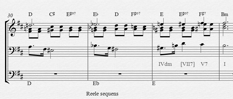 De eerste akkoorden van 30, 31 en 32 staan telkens een toon hoger: D, Eb en E. Maat 31 is zelfs in zijn geheel een reële sequens van 30, alle akkoorden zijn een halve toon opgeschoven. Ook zien we enharmoniek: de laatste akkoorden van maat 30 en 31 zijn verminderde septiemakkoorden, maar door enharmonische veranderingen lossen zij anders op dan verwacht. (E#dim7 wil eigenlijk naar F#, maar door het te beschouwen als Ddim7 kan het ook oplossen naar Eb zoals hier ook gebeurt.) Hetzelfde zien we een maat later: F#dim7 kan naar G, maar als D#dim7 ook naar E. Heel kenmerkend zijn ook de wringende dissonanten op de tweede tel van maat 30 en 31. Terwijl de hoge D in maat 30 blijft liggen klinkt daaronder op de tweede tel een C# akkoord. Een maat later hetzelfde: De hoge toon Eb botst met een D akkoord op de tweede tel. De hele toplijn van lange noten is drie maten lang chromatisch: D-Eb-E-E#-F#. Toch is er uiteindelijk een duidelijke toonsoort, in maat 32 klinkt de cadens IV-tussendominant-V-I. Waarbij IV een majeur akkoord is in plaats van een mineur akkoord (een zogenaamd dur-moll, dm, akkoord). De tussendominant in die maat is een verminderd septiemakkoord dat oplost naar de vijfde trap F#. Ik stel me zo voor dat Franck dit ook door zijn leerlingen liet analyseren en er commentaar bij leverde, wellicht opdrachten gaf om iets dergelijks te componeren.