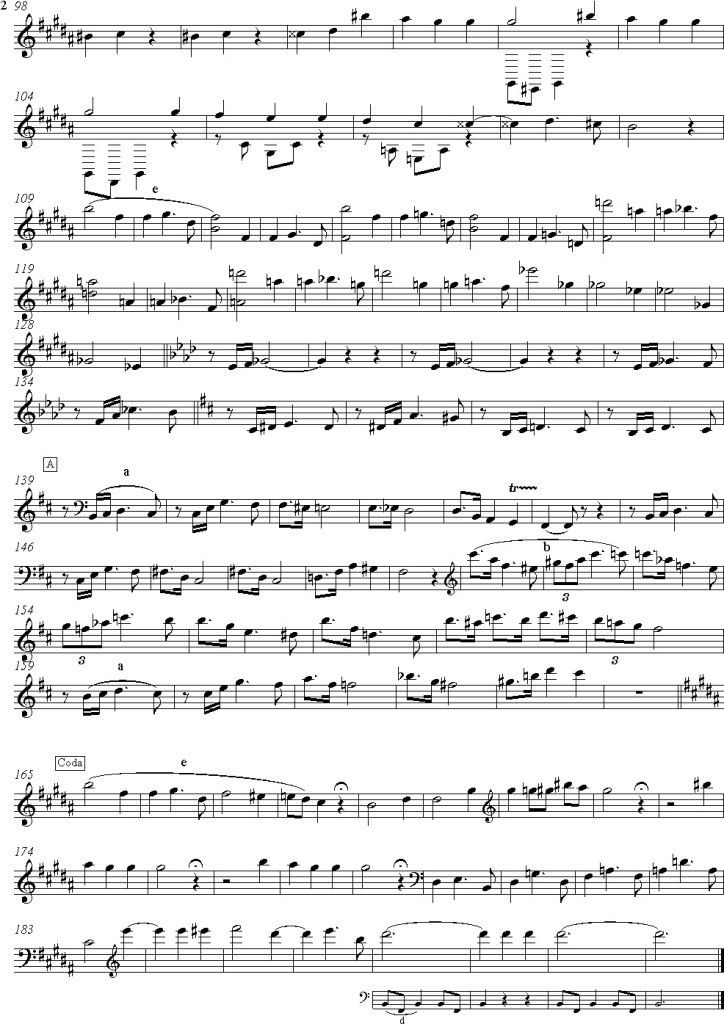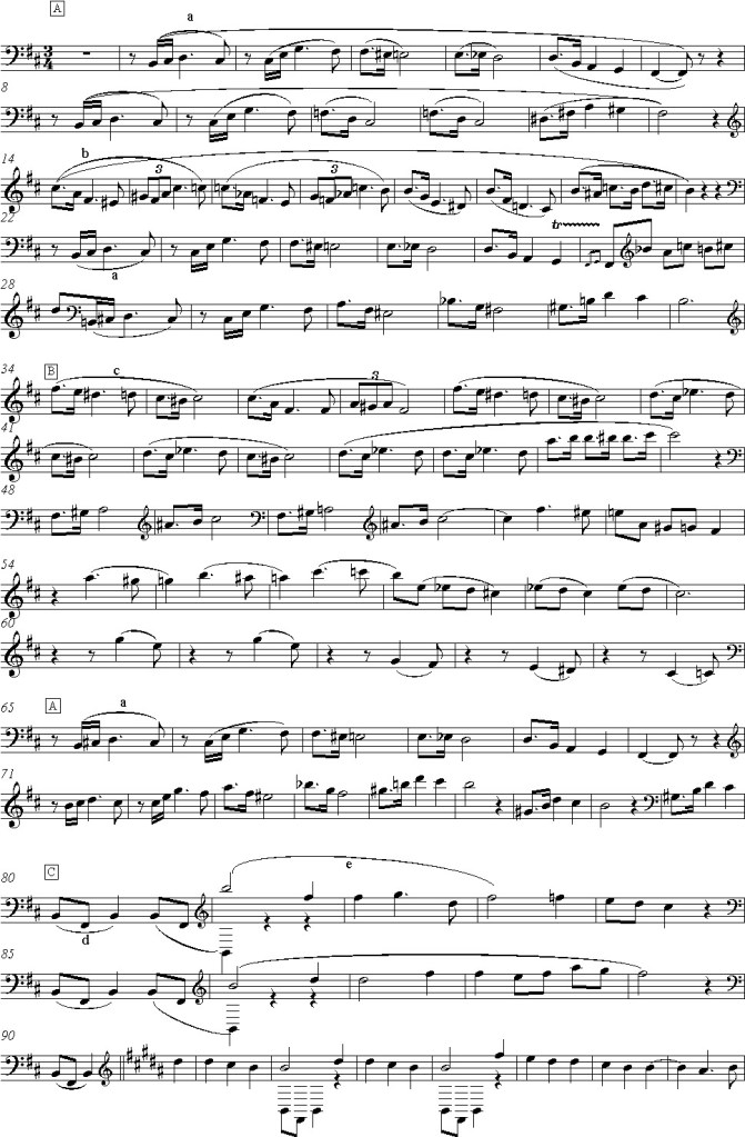 (Kijk maar eens naar deze maten: Maat 1-18 zou je ritmisch kunnen reduceren tot de figuur kwart-halve in elke maat. Dit blijft het kernidee van zowel A, B als A. Ga je nu naar de eerste maten van C, bijv. de maten 80, 82, 85 en 86, dan zien we dat deze opeens zijn te reduceren tot het omgekeerde: halve-kwart.)