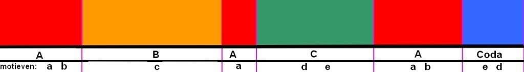 Het stuk heeft een soort rondo-vorm, waarbij je het rondo-thema A hebt van 33 maten met als hoofdmotieven a en b. Hierna komt een B deel van 79 maten met een motief c dat heel verwant is met zowel a als b, maar: dit deel is spannender. Je zou het als een soort doorwerking kunnen beschouwen. Daarna keert A met nu alleen het a motief terug (16 maten). Het echte middendeel is C, met twee nieuwe motieven d en e die meer afwijken. d valt gelijk op: in de bas klinkt een soort signaal-motief dat in een tweekwartsmaat lijkt te staan. Het e-motief is ook heel anders. Waar de meeste motieven tot dan toe vooral het basisidee “kort-lang” (kwart-halve) in zich hebben, wordt het nu juist andersom: de meeste motieven in C zijn gebaseerd op “lang-kort” (halve-kwart).