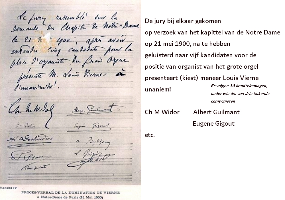 De beroemdste organist die op dit orgel gespeeld heeft is Louis Vierne. (1870-1937). Hij is denk ik wel een van de meest tragische figuren uit de muziekwereld die ik ken. Hij werd zo goed als blind geboren. Maar toen hij zeven jaar was werd hij geopereerd waarna zijn zicht aanzienlijk verbeterde. Op 16 jarige leeftijd overleed zijn vader aan maagkanker wat hem zeer aangreep. Intussen was het al duidelijk dat hij zeer muzikaal was. De jonge Vierne kreeg zijn eerste muzieklessen van zijn oom Charles Colin, hoboïst en organist en winnaar van de Prix de Rome. Hij werd van 1881 tot 1890 opgeleid aan het Institut National des Jeunes Aveugles (het nationale blindeninstituut). Hij won er de eerste prijs voor zowel viool als piano. Hij ging daarna studeren aan het Conservatoire de Paris, waar hij korte tijd les had van César Franck. Na diens spoedige overlijden studeerde hij verder bij Charles-Marie Widor. In 1894 won hij de Prix du Conservatoire, waarna hij Widors assistent werd in zowel de kerk van Saint-Sulpice als in het conservatorium van Parijs. In die tijd werd Vierne zelfs ‘Widor-junior’ genoemd. Toen Widor daar werd opgevolgd door Alexandre Guilmant, werd hij ook diens assistent.