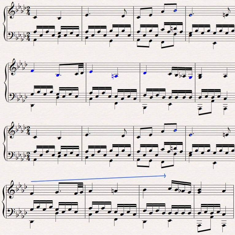 - 3- De melodie wordt in de nazin afgesloten met een prachtig verloop in drie etappes. (maat 5, maat 6 en maat 7-8). die drie etappes laten de dramatiek van een dalende kwint horen, die het geheel tegelijk heel evenwichtig maakt. Het begin van die dalende kwint zit in het einde van de voorzin, dat zit zo: de laatste noot van maat drie is tevens de hoogste noot van dit thema, een Bb. Deze Bb springt met een kwint naar beneden naar de laatste noot van de voorzin, de Eb. Deze dalende kwint vormt vervolgens de basis van het antwoord in de nazin, welk in de kern uit sequensen van dalende kwinten bestaat. Zie de in de kleur blauw weergegeven noten. Hiermee is er een sterke motivische band tussen voor-en nazin tot stand gekomen. Maar ook de dramatiek van die kwint zelf werkt heel sterk, in al zijn eenvoud. In onderstaand notenvoorbeeld eerst nogmaals het geheel (eerste acht maten), daarna nog een keer het geheel, maar de laatste vier maten in een aangepaste versie.