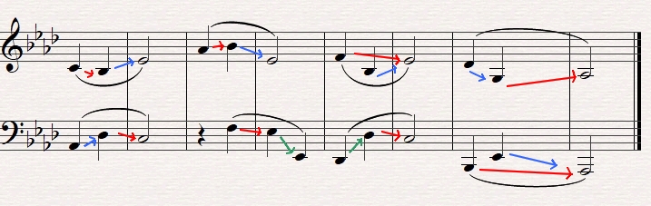- 4. Dit aspect lijkt op het eerste gezicht niet zo bijzonder : de richting van de melodie. Maar het mag zeker toch worden vermeld: het is een melodie die je kunt nazingen en kunt onthouden, hij sluit aan bij een logisch gebruik van onze stem. In de kern kun je deze melodie reduceren tot vier motieven in de sopraan en vier motieven in de bas, die een wonderbaarlijke eenheid vormen, waarbij het interval van een kwart of kwint (blauwe pijltje) verbonden wordt door een secunde, dalend of stijgend (rode pijltje). Ook de gespiegelde octaafmotieven (groene pijltje) in de bas die de voor- en nazin verbinden vormen een onderdeel van dit prachtige plaatje.