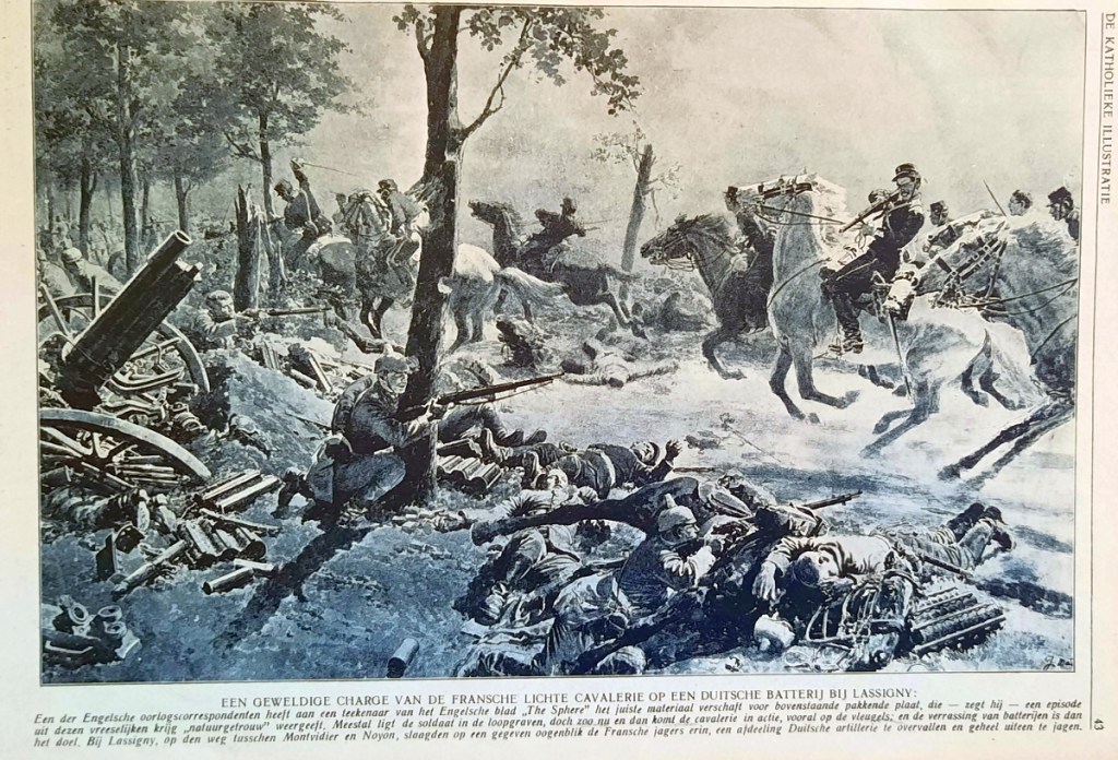 Omdat er geen echte gevechtsfoto’s te zien zijn worden dergelijke taferelen gewoon getekend. Hier van een gevecht in Lassigny
