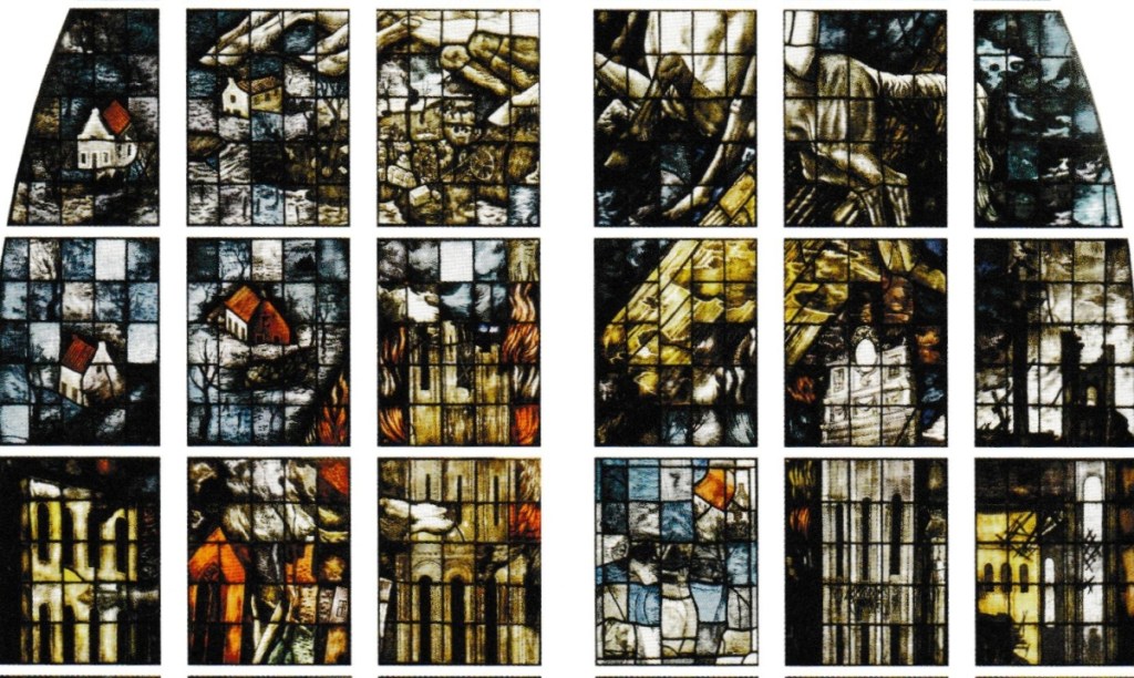 Centraal op de afbeelding staan Nederlanders met hun vlag, maar we zien in het glas ook gebeurtenissen die terug verwijzen naar de eerdere verschrikkingen, zoals mensen die opgepakt worden, onderduikers, mensen in een concentratiekamp, de stadsbranden van Rotterdam enz.