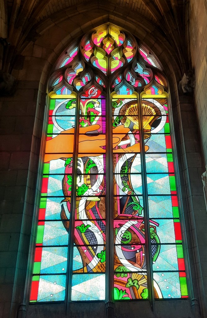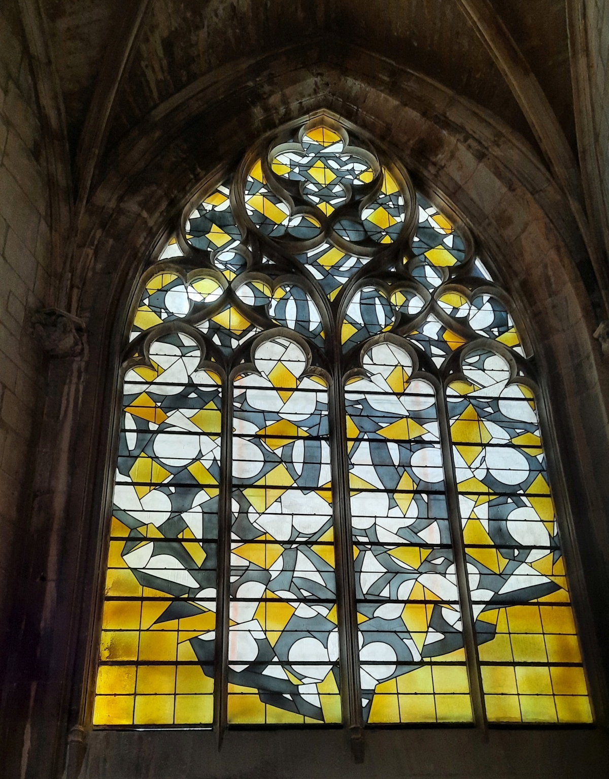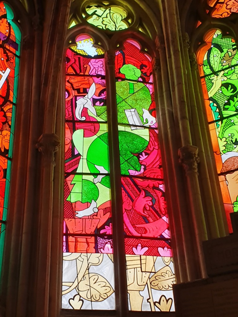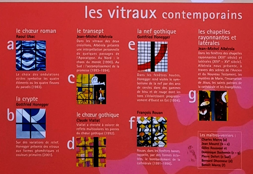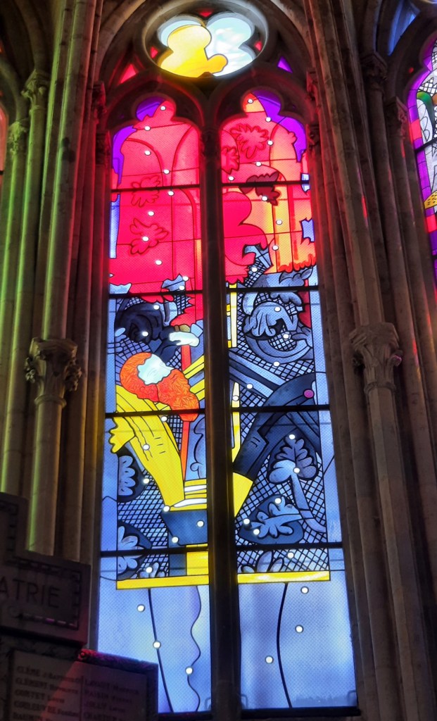De moderne glas-in-lood-ramen zijn schitterend. Als de zon hier opstaat ontstaat er een prachtig kleurenspel in de kerk. Er zijn zeven moderne kunstenaars mee bezig geweest, die het allemaal op hun eigen manier hebben uitgewerkt. Persoonlijk vind ik de glas-in-lood-ramen van Jean-Michel Albérola in het transept het mooiste.