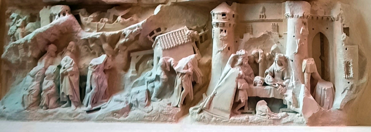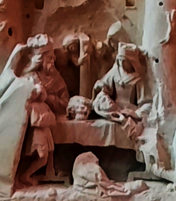 Achter de tafel staan een koning en koningin. De koningin lijkt het dode vrouwenhoofd te strelen. Kinderen staan er nieuwsgierig bij, op de grond ligt (waarschijnlijk) een hond. Er is geen toelichting te vinden bij dit reliëf, wellicht wordt er ook wel iets totaal anders uitgebeeld. Wie weet kom ik daar nog achter en zal dan deze tekst aanpassen.