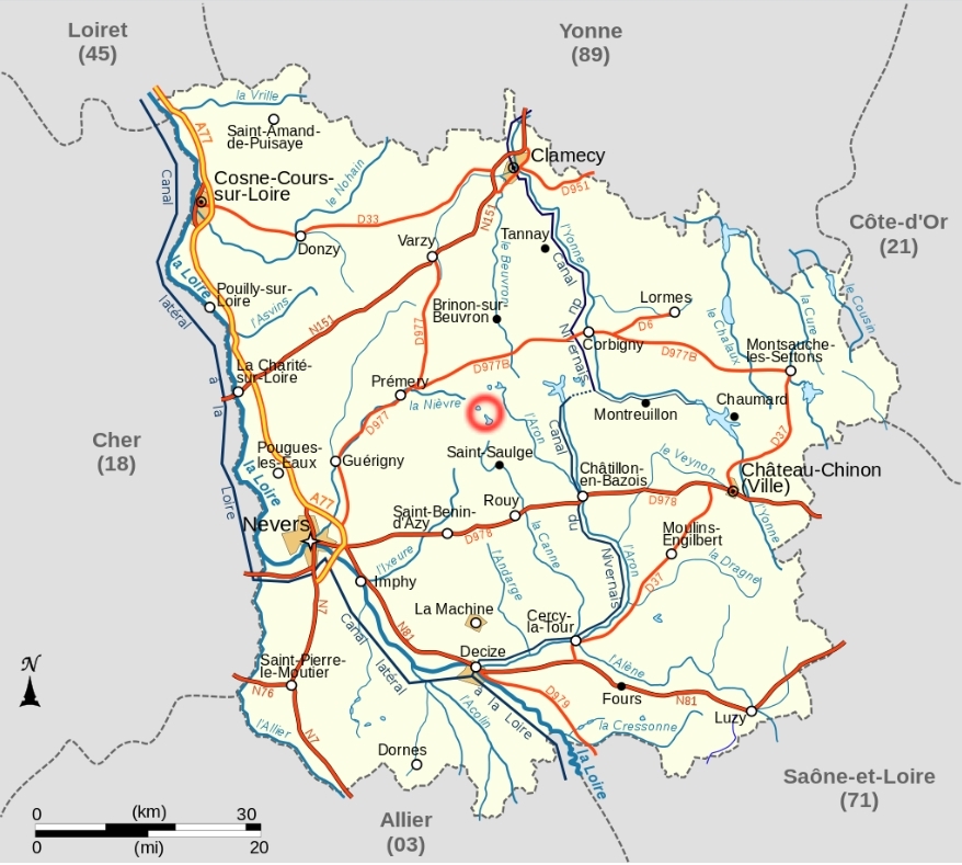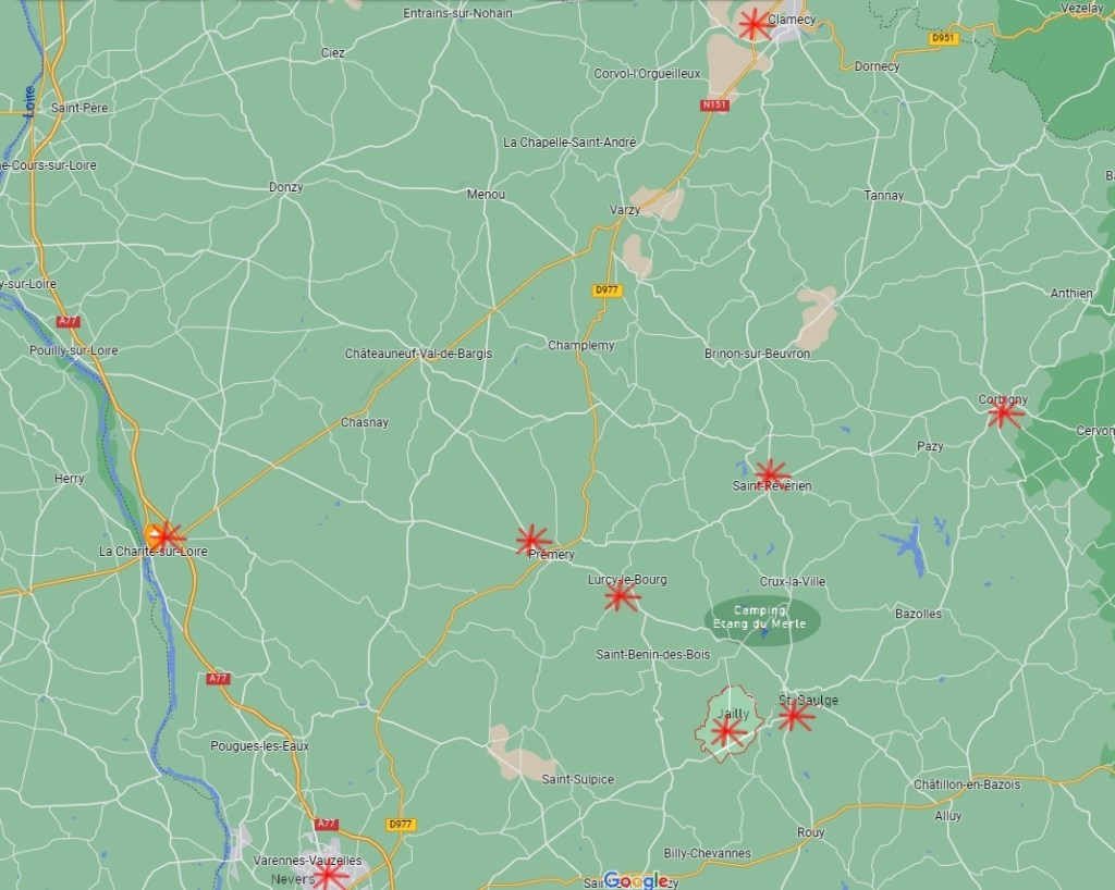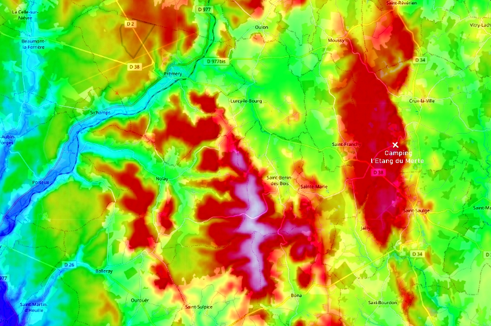 De hoofdstad van dit departement is Nevers. Het departement bestaat uit verschillende natuurlijke regio’s. De westelijke grens wordt gevormd door het brede Loiredal, waar zich ter hoogte van Nevers de Allier bij de Loire voegt. In het noordwesten liggen vochtige plateaus, rijk aan meren en bossen. Het centrum van het departement wordt gevormd door kalkheuvels. Deze “Collines du Nivernais” worden gekenmerkt door een grootvlakkige afwisseling van landbouwgrond en loofbossen, vooral ook met uitgestrekte eikenbossen. In het oosten ligt het met gemengd bos begroeide massief van de Morvan. Parallel aan de rivieren Aron en Yonne loopt van zuid naar noord het Canal du Nivernais dat dwars door Clamecy gaat. Wij bevonden ons op Camping Étang du Merle, een beetje in het midden, op bovenstaande kaart iets ten noorden van Saint-Saulge. (Zie het omcirkelde rode rondje, dat rondom het Étang du Merle staat). Bij ons waren er vooral meertjes en bossen. Het gebied lag relatief hoog, wat je op een hoogtekaart goed kunt zien. Rechts, met een wit kruisje is de plek van onze camping aangeduid.