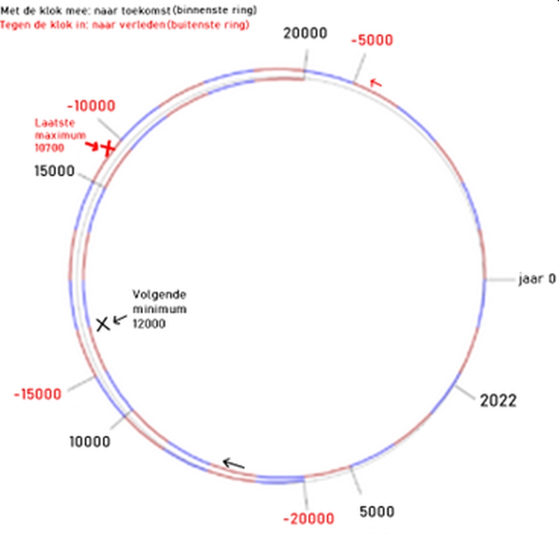 Dan is er nog iets. De hellingshoek schommelt in de loop van de eeuwen enigszins. Bij een maximum van ongeveer 24,50 graden zijn de dagen in de winter nog korter en de zomers nog langer. Bij een minimum van 22,10 is dat omgekeerd. Op onderstaande afbeelding kun je zien hoe deze schommeling plaats vindt. Hij schommelt op en neer, elke zwiep duurt zo’n 13.000 jaar, dan gaat hij weer de andere kant op.
