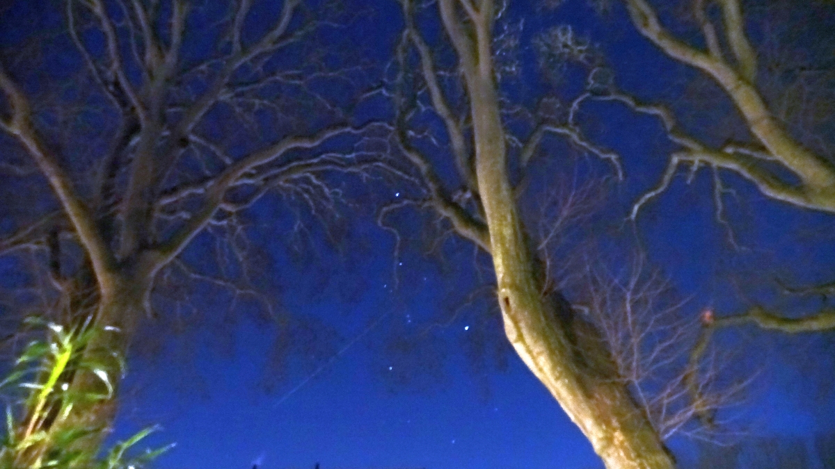 Mars staat deze dagen in de avond heel hoog in de lucht. Het is een kwestie van recht omhoog kijken en Mars is een beetje roodachtig: niet te missen. Ik maakte een foto met Mars, rechts van Mars zie je vaag de Pleïaden, er onder zie je de reuzenster Aldebaran en links onder zie je het sterrenbeeld Orion. Dwars door Orion zie je een vliegtuigstreep, van rechts naar links vloog daar net een vliegtuig, het vliegtuig staat op de foto, links als een soort ster. Het sterrenbeeld Orion staat ook op de onderste foto, tussen een paar bomen door. Het vliegtuig zie je daar dan niet meer, de streep nog wel. Die is intussen al wat langer geworden.
