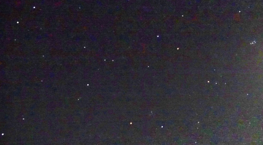 In het ONO staat de Grote beer. Vandaar uit kun je in het noorden de Poolster makkelijk vinden: trek vanuit het uiteinden van de steel van het steelpannetje een lijn naar links en de eerste de beste ster die helder is en daar ongeveer staat is de Poolster. Op onderstaande foto zie je als je weet hoe je moet kijken vervolgens ook goed het kleine steelpannetje oftewel de kleine beer. Je ziet dat je van deze zeven sterren vooral het einde van de steel (de poolster) en de twee uiterste sterren van het kleine steelpannetje goed kunt zien. Ook zijn de kleurverschillen goed zichtbaar. De sterren die iets meer geelachtig zijn dat zijn “rode reuzen”, grote sterren die aan het einde van hun levensfase zijn.