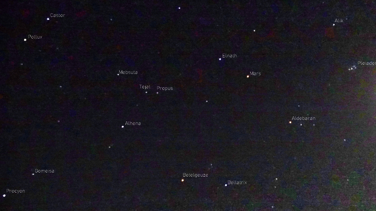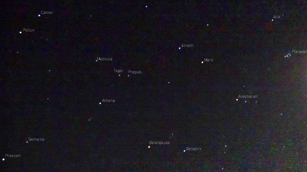 Deze avonden zie je bijna recht boven je Mars en dan richting de zuidelijke horizon zie je nog veel meer sterren. Op onderstaand plaatje zie je grofweg aan de linkerkant sterren van het sterrenbeeld Tweelingen, met links de twee voornaamste vertegenwoordigers van dat sterrenbeeld: Castor en Pollux. Mars staat in het sterrenbeeld Stier, met onder zich de voornaamste ster van dat beeld, Aldebaran. Helemaal beneden zie je de bovenste twee sterren van het sterrenbeeld Orion: Betelgeuze en Bellatrix. Rechts van Mars zie je het Zevengesternte, oftewel de Pleiaden. Ik heb de afbeelding twee keer hieronder gezet, de tweede keer met de namen van Mars en de best zichtbare sterren erbij. Mars, Aldebaran en Betelgeuze zien er een beetje rood-geel-achtig uit, het verschil is ook op de foto’s te zien.