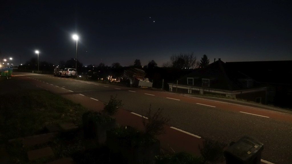 Zo dadelijk werp ik nog een blik op het noorden, om het noorderlicht te zien. De kans is erg klein. Venus en Jupiter zijn nu (het is 10 voor 10) alweer onder de horizon verdwenen. Morgen is de echte conjunctie!