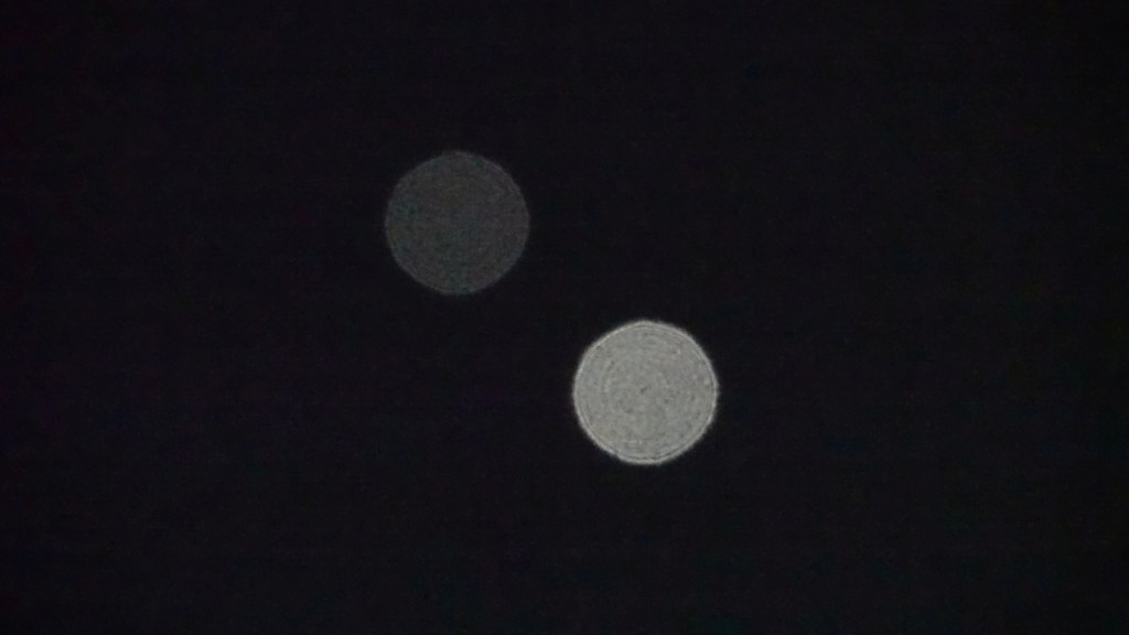 Van de conjunctie van Venus en Jupiter laat ik twee foto’s zien. Jupiter staat nog steeds boven Venus. De tweede foto zoom ik in, dat kan dus zoals je ziet met een planeet. Niet dat je dan echt details te zien krijgt trouwens. Venus wordt omgeven door een zeer dichte atmosfeer waardoor je het oppervlak nooit te zien krijgt. Jupiter is een gasreus, je kunt soms wel stormen in die gaswolken onderscheiden. Met een telescoop kan dat heel goed.
