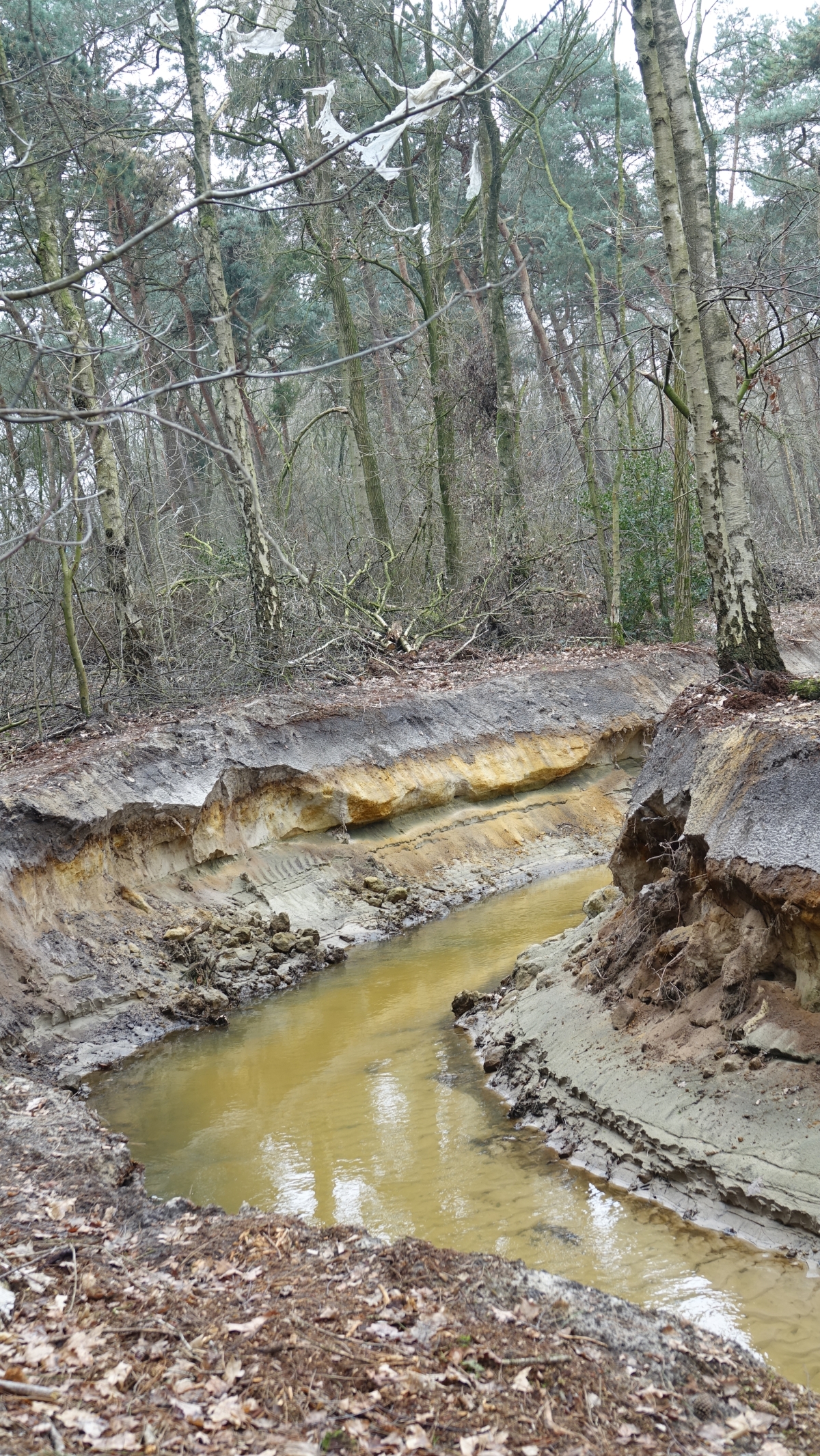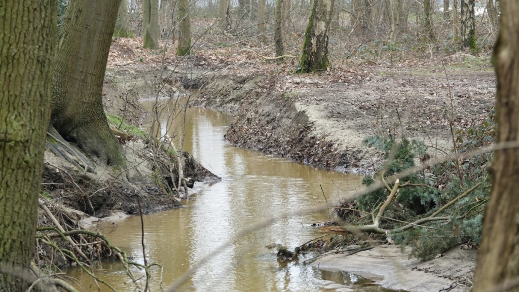Er waren niet zo lang geleden zo te zien werkzaamheden geweest, de beek was diep uitgegraven. Men had de stroomrichting op veel plaatsen veranderd om de beek weer op een natuurlijke manier te laten meanderen.