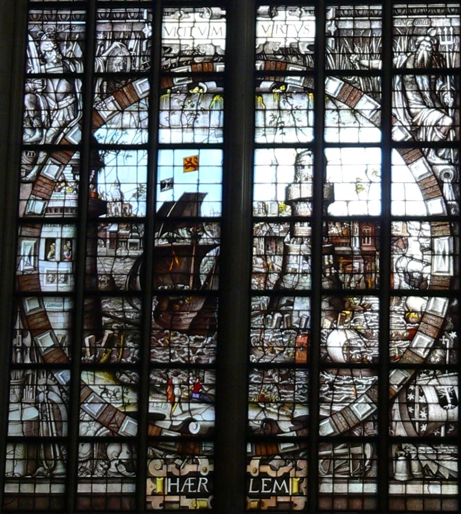 Glas 2, 1597, door Willem Thybaut. We zien de inneming van Damiate. De Egyptische havenstad Damiate werd in 1219 veroverd door de kruisvaarders, waarbij de Haarlemse kruisvaarders zich in het bijzonder hebben onderscheiden. Een schip vaart met volle zeilen de haven binnen en verbreekt de zware ketting waarmee de haven was afgesloten. Het glas is geschonken door de stad Haarlem, ter meerdere eer en glorie van deze stad.