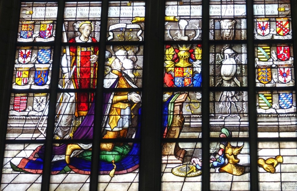 De opdrachtgever van dit glas is namelijk Erik II van Brunswijk-Calenberg-Göttingen, heer van Woerden. Hij zit (op de afbeelding hieronder) geknield op een kussen voor een bidstoel. Achter hem staat een heilige met een rooster in zijn handen. Dat is natuurlijk Laurentius, die volgens de legende levend op een gloeiend rooster werd gemarteld. De naam Erik is niet gekoppeld aan een internationale heilige, hij komt uit Scandinavië. Misschien had deze Erik als tweede voornaam Laurentius? Hij diende in het leger van keizer Karel V en daarna ook dat van Filips II, en nam deel aan enkele oorlogen. Gedurende de Slag van Saint-Quentin (1557) maakte hij zich verdienstelijk door twee belangrijke mensen als gijzelaar gevangen te nemen. Zij bleken een belangrijke troef bij de vredesonderhandelingen. Als blijk van dank kreeg hij in 1558 van Filips II de heerlijkheid Woerden. In september 1566, het jaar van de Beeldenstorm, onderdrukte deze Erik van Brunswijk met harde hand een poging om de lutherse eredienst in te voeren in de Petruskerk in Woerden. Waar in datzelfde jaar de abdis van Rijnsburg overstag ging bleef Erik van Brunswijk dus trouw aan de oude religie. In datzelfde jaar gaf hij daar nogmaals blijk van met de schenking van dit glas “De tempeluitdrijving van Heliodorus” aan de St.-Janskerk in Gouda. Op het glas (hieronder, in de top) staat de tekst “Catholicae religionis ergo” (vanwege de katholieke godsdienst). Hij was niet alleen heer van Woerden, kijk maar naar de tekstband: de illustere Eric, dank aan God, hertog van Brunswijk en heer van Luneburg, Baro, Liesveld en Woerden, vanwege de katholieke religie, 1566. Eerbiedig heeft hij zijn wapenuitrusting voor zich op de grond gelegd. We zien een helm, schild, espa (dubbele bijl) en handschoenen. De getoonde wapenschilden links en rechts zijn niet die van Hollandse steden maar juist van Duitse steden (Stolberg) keurvorstendommen (Brandenburg), hertogdommen (Saksen) enz. Hij liet zien dat hij niet de minste was!