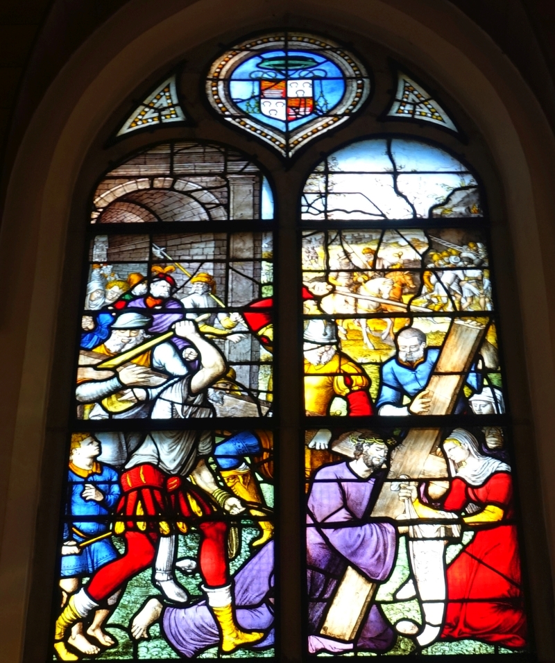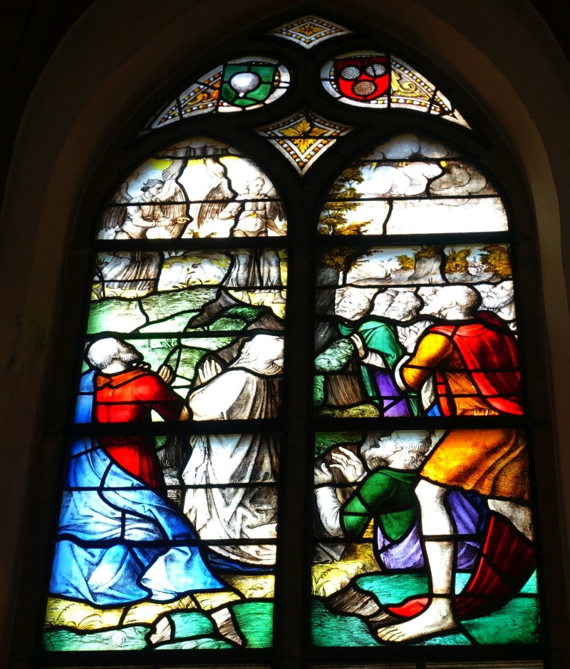Persoonlijk lijkt het mij het meest aannemelijk dat er negen glazen zijn geweest. In het oosten helemaal centraal Jezus aan het kruis. Dat is een sterk symbool waar de mensen in de kapel dan automatisch op gericht zijn: het lijden van Christus op het hoogtepunt. Net zoals in alle katholieke huizen op een centraal punt een kruisbeeld hing. En dan symmetrisch aan twee kanten de andere glazen. Ik vermoed links de gevangenneming, de bespotting, de afbeelding met “ecce homo” en de kruisdraging. Rechts de graflegging, de opstanding (Pasen), de Hemelvaart en Pinksteren.